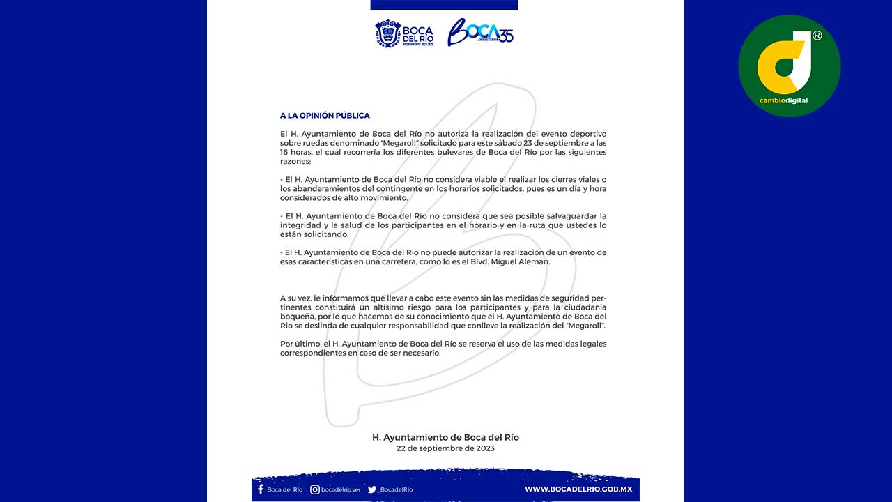 Ayuntamiento de Boca del Río no autoriza realización del evento deportivo "Megaroll"