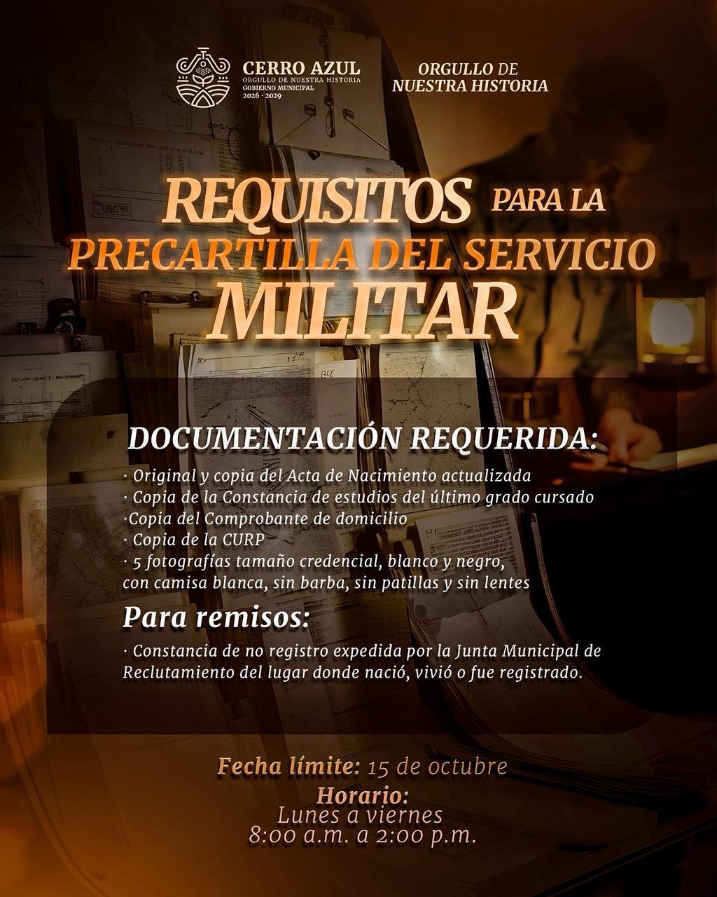 Cerro Azul, Ver.- La administración municipal de Cerro Azul que encabeza Fernando Hernández Spinoso en coordinación con el 5.º Batallón de Ingenieros de Combate, informa a la ciudadanía que se encuentra disponible el trámite para la solicitud de la precartilla del Servicio Militar Nacional, dirigido a jóvenes que han cumplido 18 años, así como a personas en calidad de remisos.