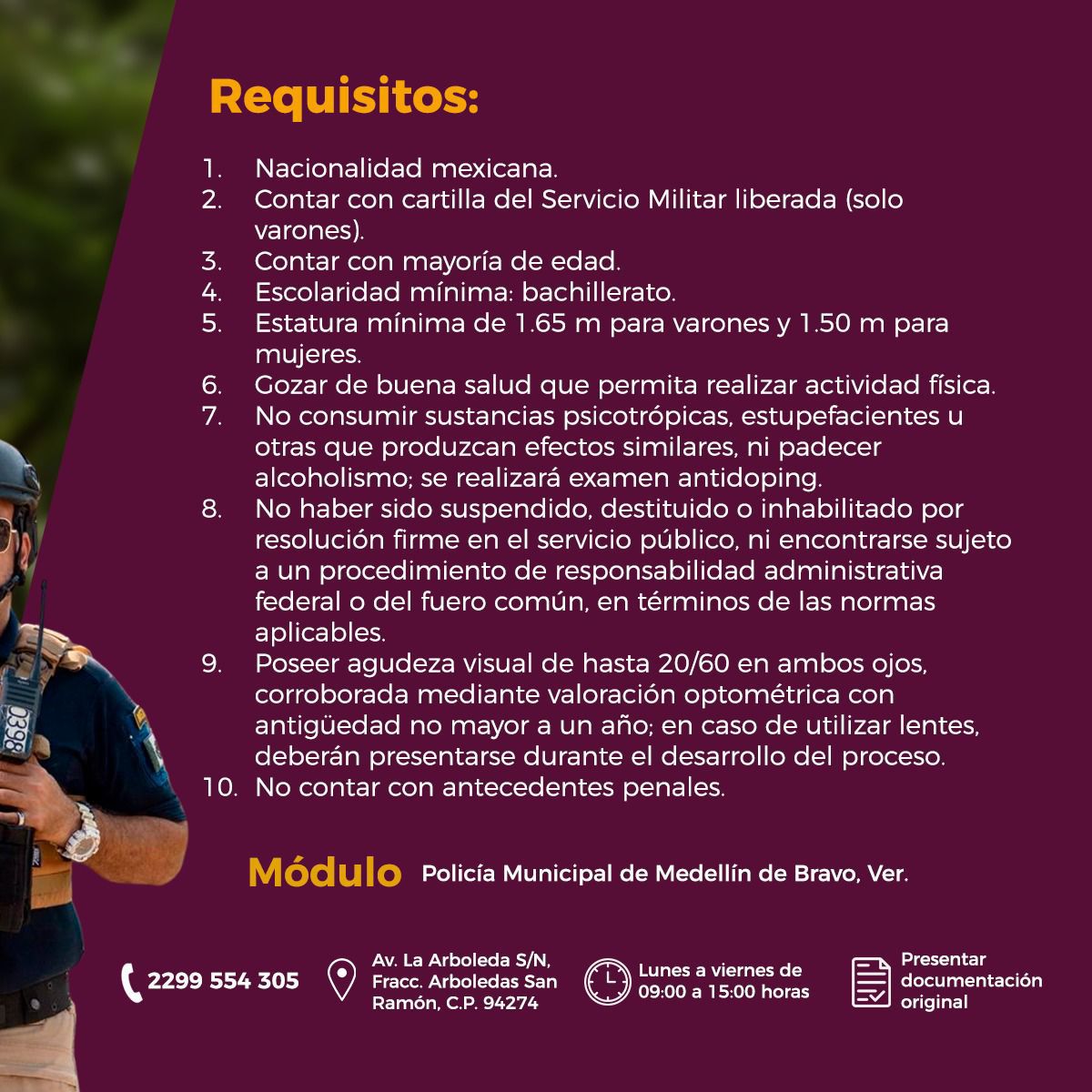 Medellín de Bravo, Ver.- Con el objetivo de fortalecer la seguridad y continuar construyendo un municipio más ordenado y tranquilo, el Ayuntamiento de Medellín de Bravo, encabezado por el presidente municipal Samuel Acosta, informa a la ciudadanía que se encuentra abierta la convocatoria para integrarse a la Policía Municipal.