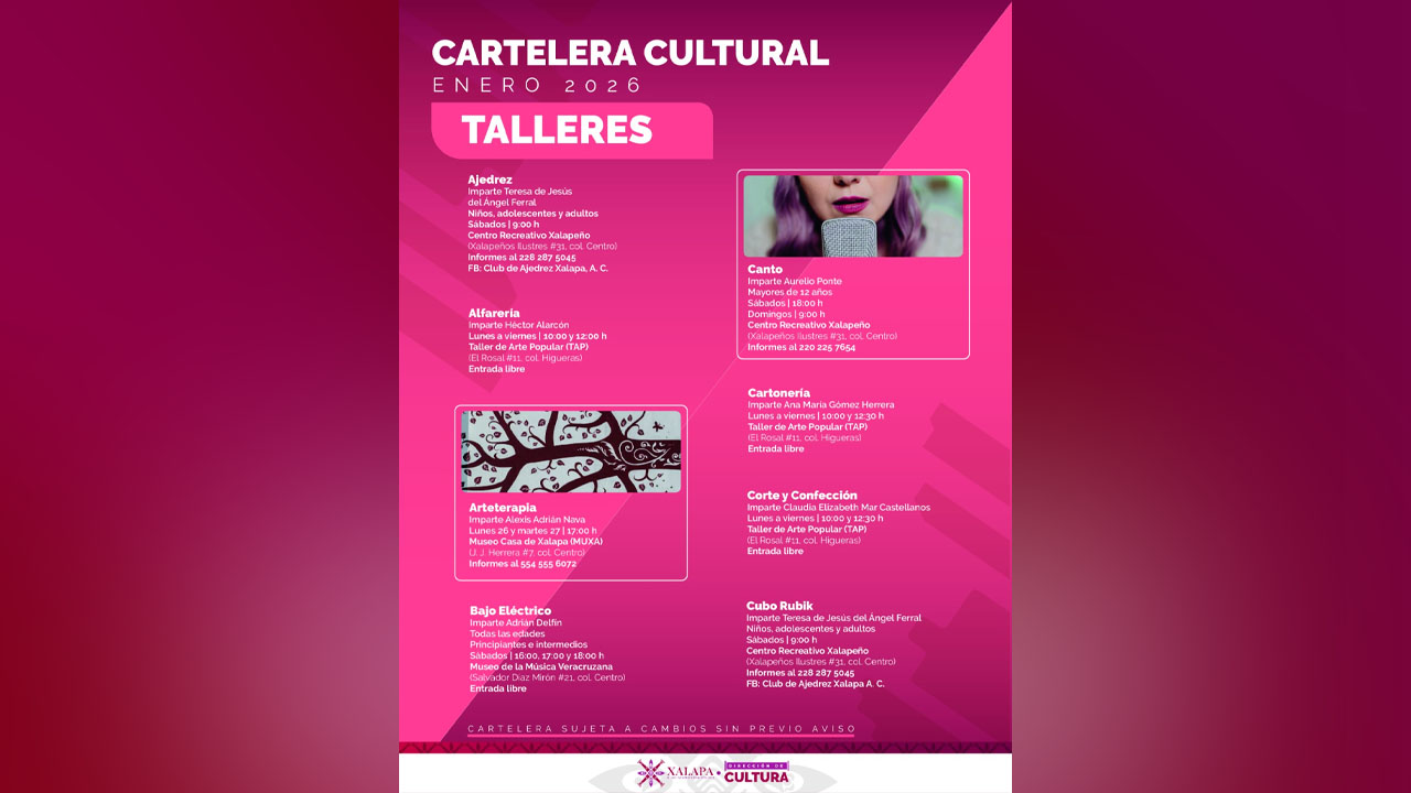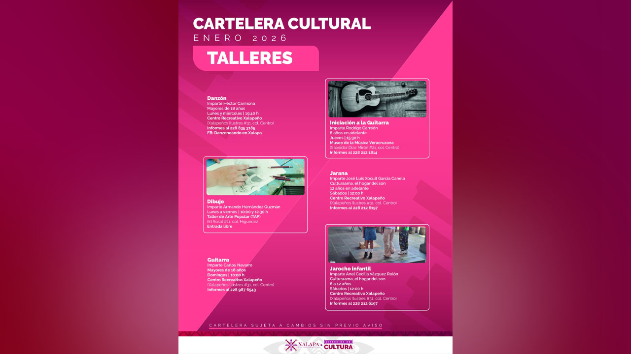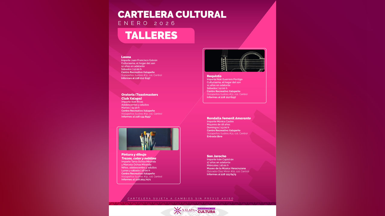 Xalapa, Ver., 16 de enero de 2026.- Talleres, cine, música y más incluye la agenda cultural que organiza el Ayuntamiento de Xalapa para recreación de las familias, en distintos recintos y espacios públicos.