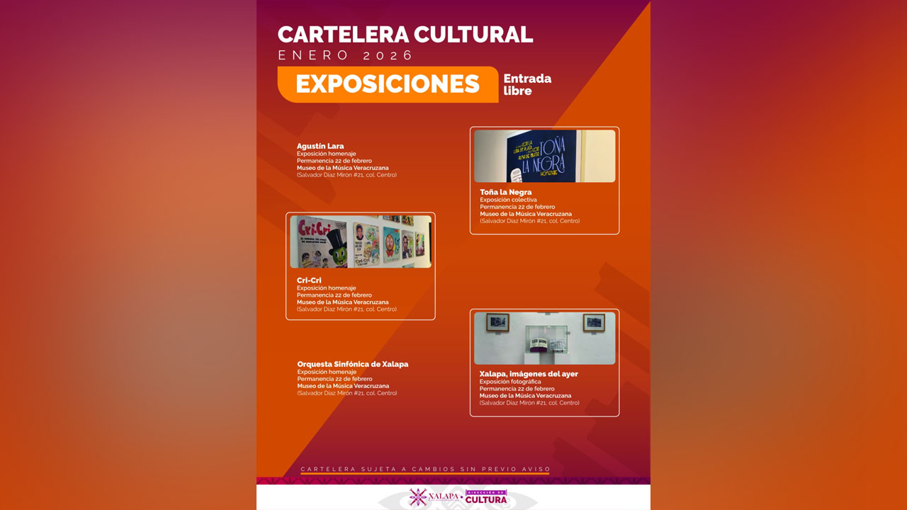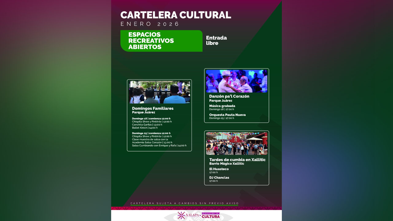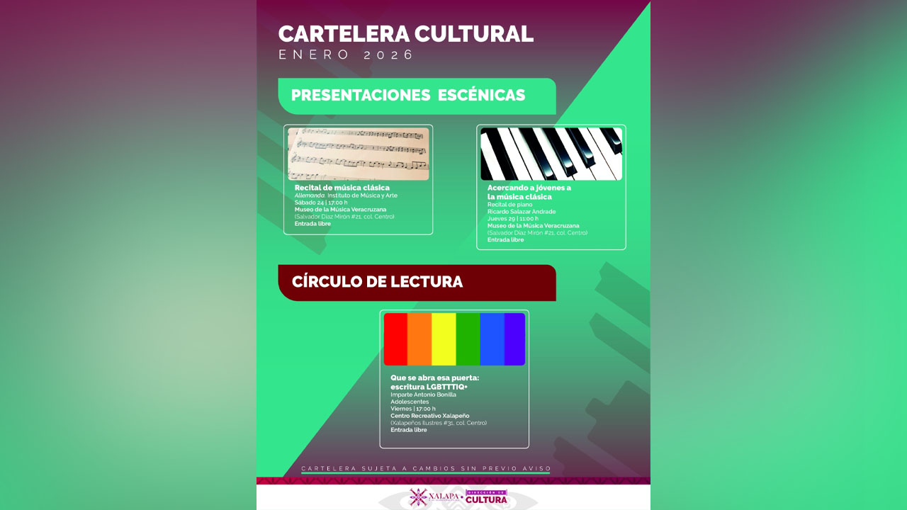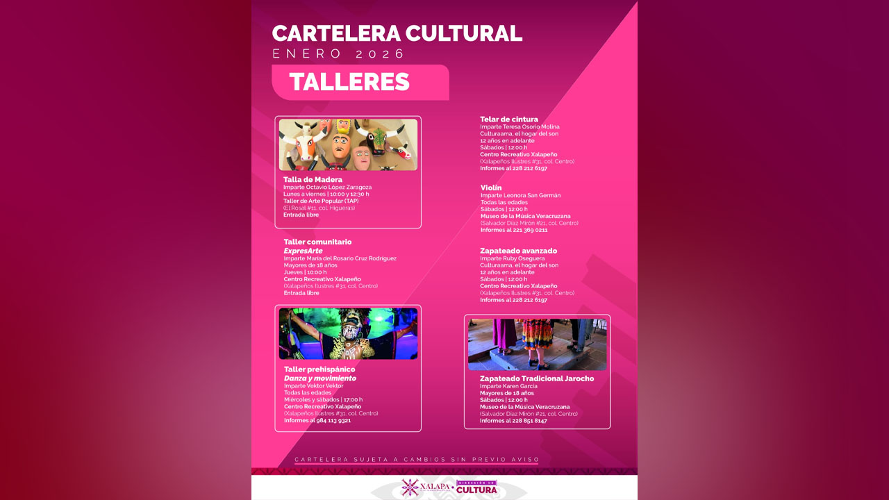 Xalapa, Ver., 16 de enero de 2026.- Talleres, cine, música y más incluye la agenda cultural que organiza el Ayuntamiento de Xalapa para recreación de las familias, en distintos recintos y espacios públicos.