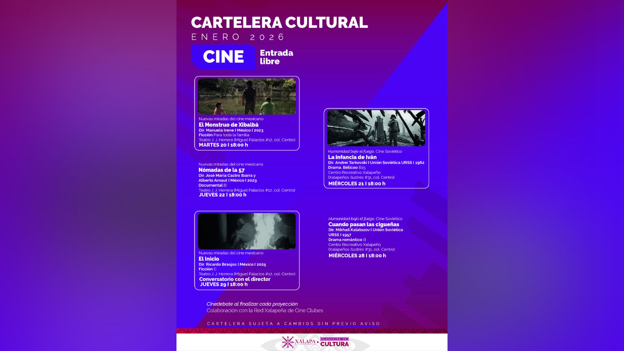 En el Teatro J. J. Herrera, el próximo martes a las 18:00 horas, se proyectará “El Monstruo de Xibalbá”, y el jueves 22 de enero, “Nómadas de la 57”. El jueves 29 de enero se exhibirá “El Inicio”. En el CRX, los miércoles, a las 19:00 horas, se proyectarán las películas “La infancia de Iván” y “Cuando pasan las cigüeñas”, como parte del ciclo “Humanidad bajo fuego, cine soviético”.