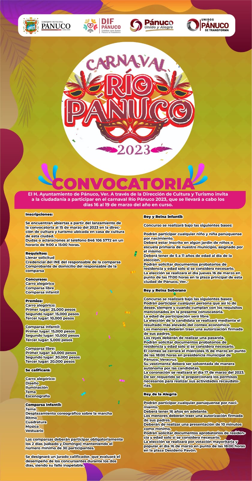 Con el nombre de Carnaval Río Pánuco 2023 se dio a conocer la convocatoria a través de la Dirección de Cultura y Turismo, donde las inscripciones se encuentran abiertas hasta el cierre que será el día 15 de marzo, todos los que deseen participar pueden acudir a la casa de cultura en horario de 9:00 a 3:00 de la tarde o comunicarse al teléfono: 8461065772 para mayores informes.