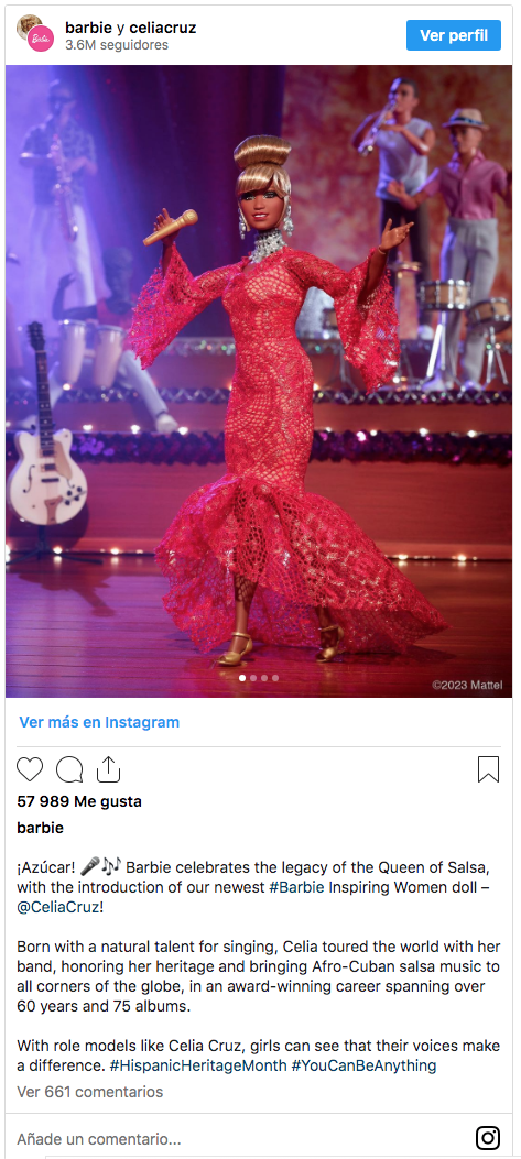 “Barbie celebra el legado de la Reina de la Salsa con la presentación de nuestra nueva muñeca Barbie Inspiring Women. Ella es ícono musical galardonado cuya carrera abarcó más de seis décadas y 75 álbumes, al mismo tiempo que honra su herencia e introduce la música afrocubana a la corriente principal. Un verdadero modelo a seguir, el deslumbrante arte y el legado de Celia Cruz continúan inspirando a niñas de todo el mundo a usar su voz para marcar la diferencia. ¡Azúcar!”, se lee en la publicación de Barbie en Instagram.