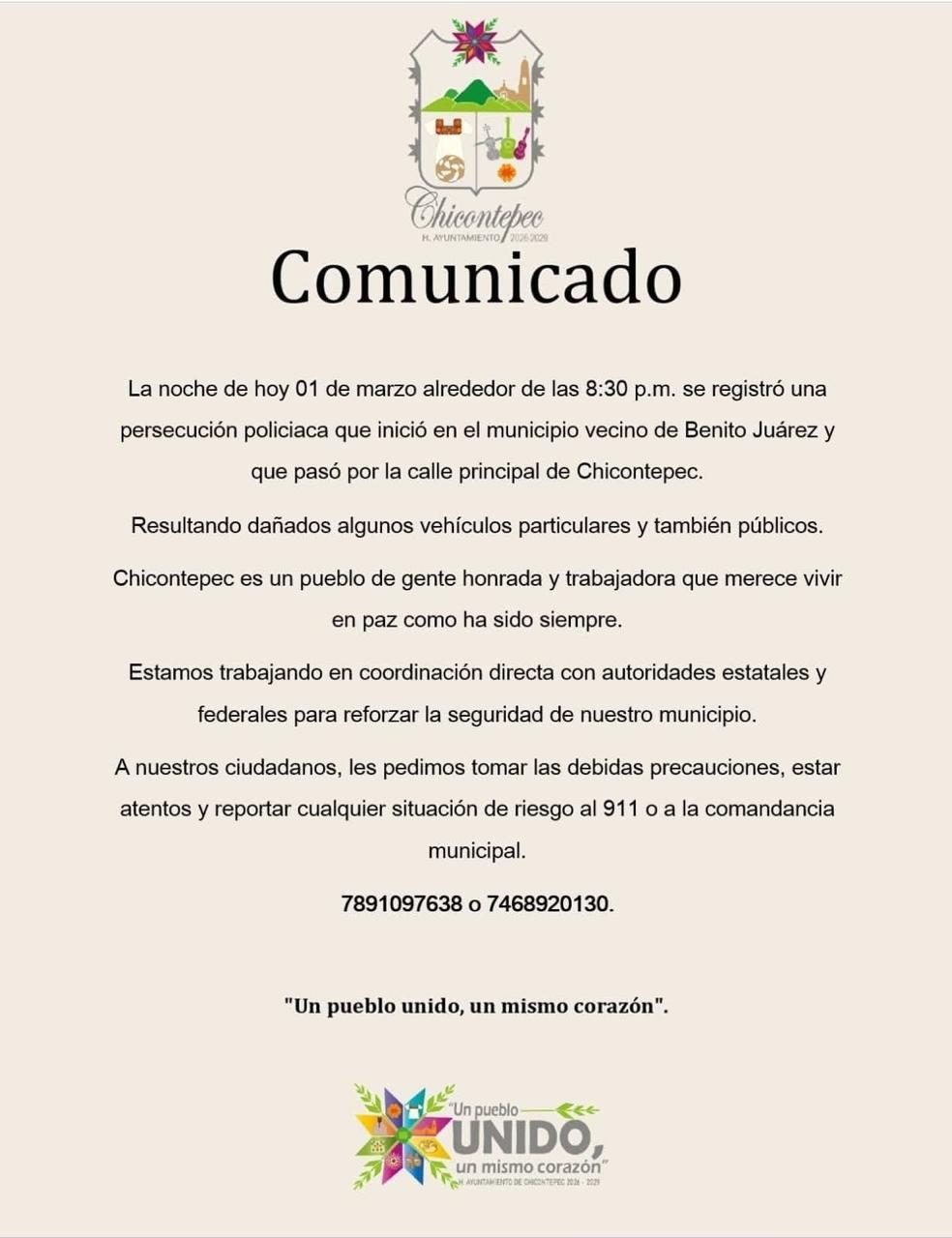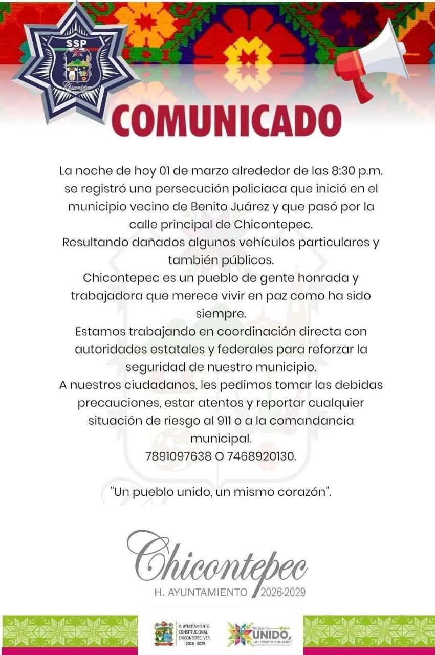 “La noche de hoy 01 de marzo alrededor de las 8:30 p.m. se registró una persecución policiaca que inició en el municipio vecino de Benito Juárez y que pasó por la calle principal de Chicontepec. Resultando dañados algunos vehículos particulares y también públicos”.