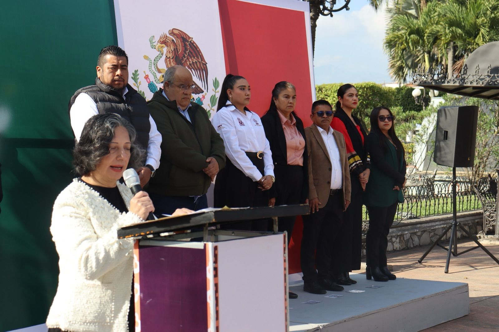 Durante el evento, la cronista de la ciudad, Minerva Salas Bretón ofreció una elocuente reseña histórica en la que destacó la trascendencia de la bandera como el vínculo más fuerte de unión entre los mexicanos. Detalló la trayectoria de nuestro lábaro patrio, el cual ha pasado por diversas modificaciones hasta consolidarse como el emblema de soberanía y libertad que hoy nos representa.
