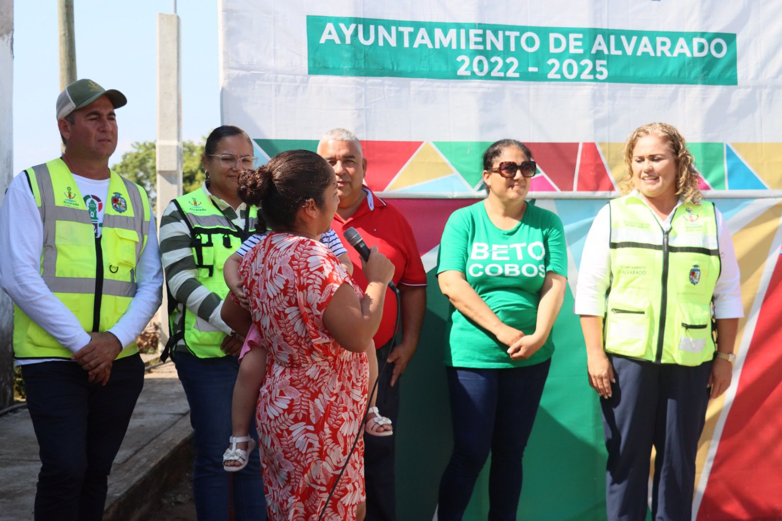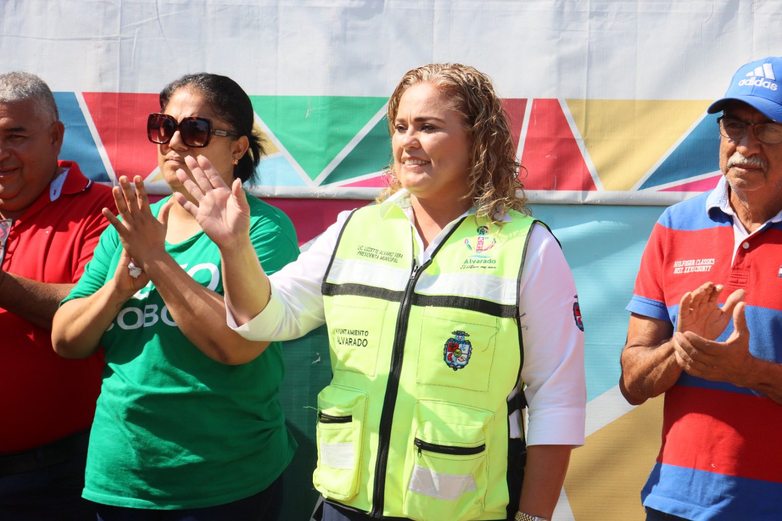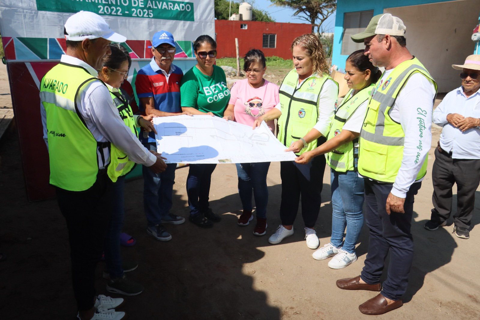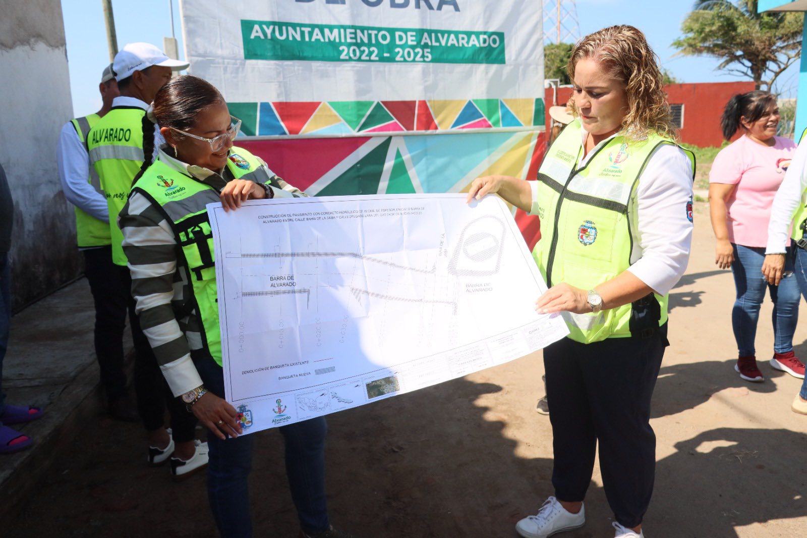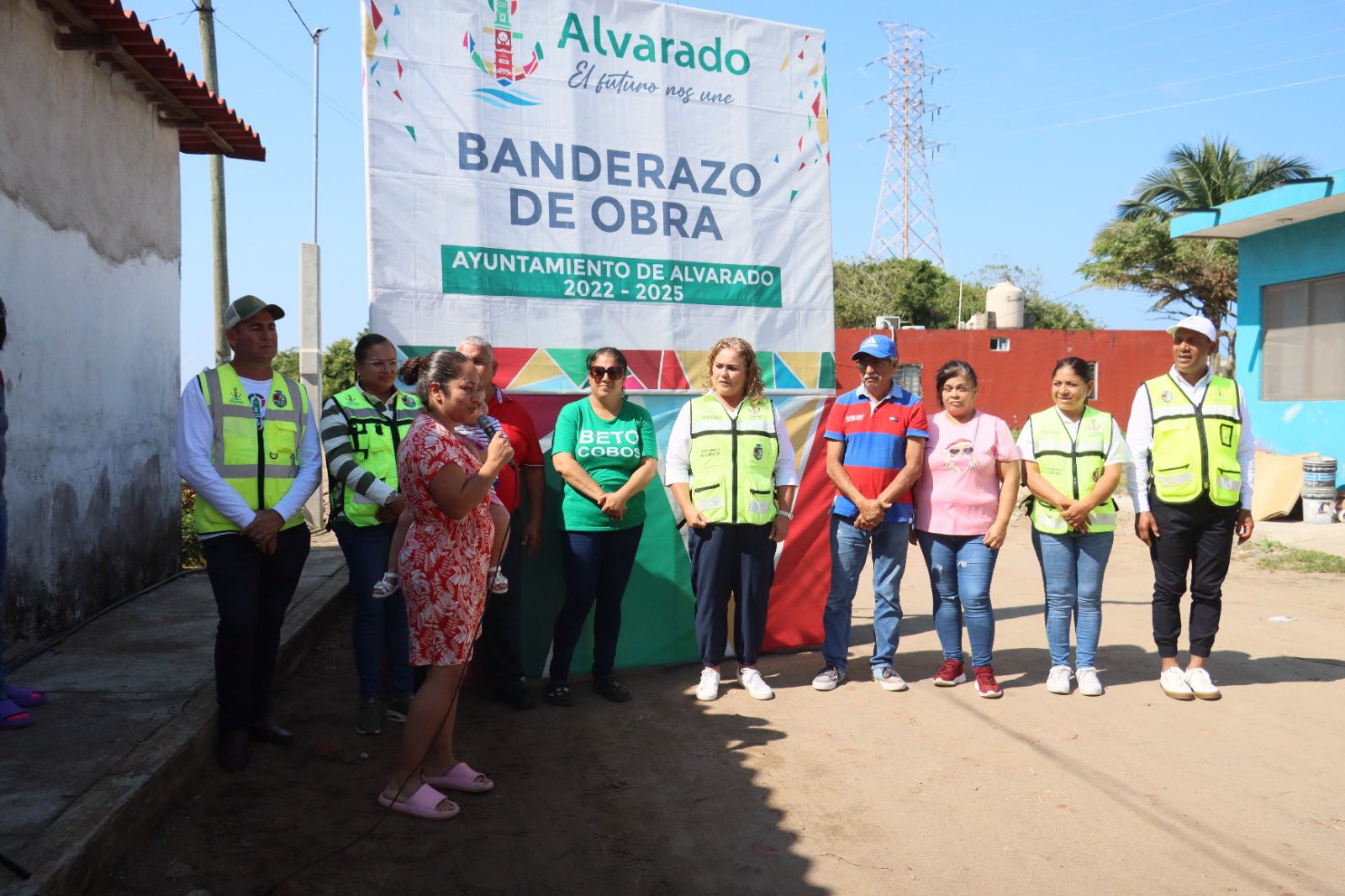 Alvarado, Ver.- Con el firme compromiso de seguir impulsando el desarrollo urbano y mejorar la movilidad en el municipio, la alcaldesa de Alvarado, Lizzette Álvarez Vera, acompañada de regidores y vecinos, dio el banderazo de inicio de los trabajos de pavimentación con concreto hidráulico, construcción de guarniciones y banquetas en la calle Genoveva Delgado, conocida también como Barra de Alvarado, en la colonia Villas de Alvarado.