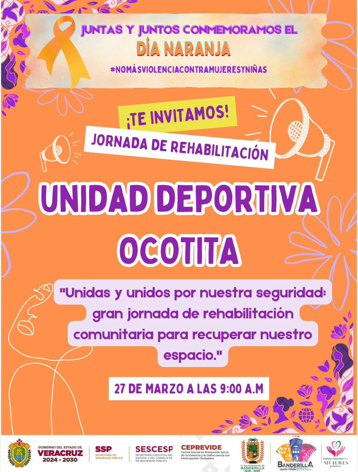 Para pasar del mensaje a la acción, el Gobierno Municipal de Banderilla presidido por José Antonio Sangabriel Fernández a través del Instituto Municipal de las Mujeres, en coordinación con la SSP, SESCESP y CEPREVIDE, te invita a la jornada de rehabilitación comunitaria “Unidas y unidos por nuestra seguridad: Recuperemos nuestro espacio”.