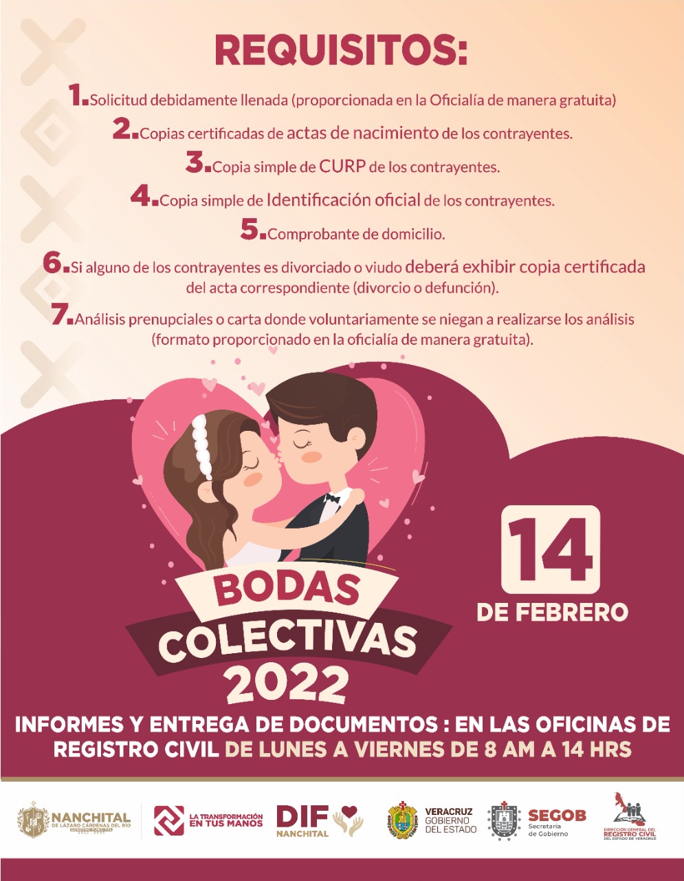 Nanchital, Ver.- El ayuntamiento de Nanchital que encabeza la alcaldesa, Esmeralda Mora Zamudio, en coordinación con el Sistema DIF Municipal y el Registro Civil, invitan a las parejas que buscan formalizar su unión a participar en las "Bodas Colectivas 2022" que se llevarán a cabo el próximo 14 de febrero en el marco del Día del Amor y la Amistad.