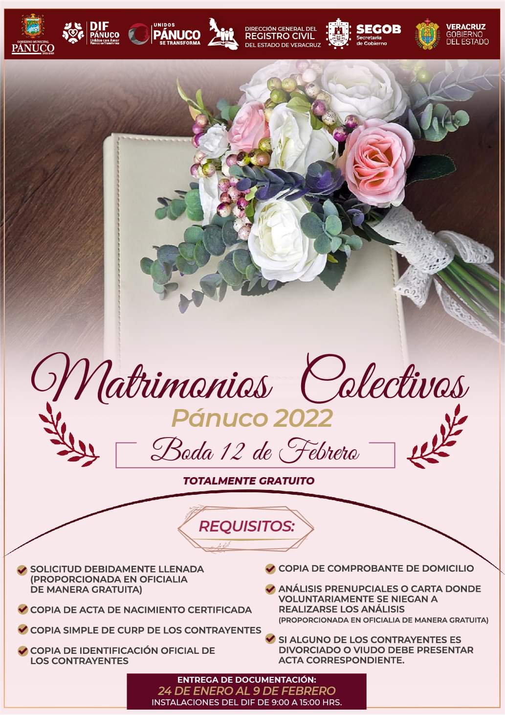 Pánuco, Ver.- Este sábado 12 de febrero se llevará a cabo el evento de matrimonios colectivos por parte del H. ayuntamiento de Pánuco en coordinación con el DIF municipal y el Registro civil.