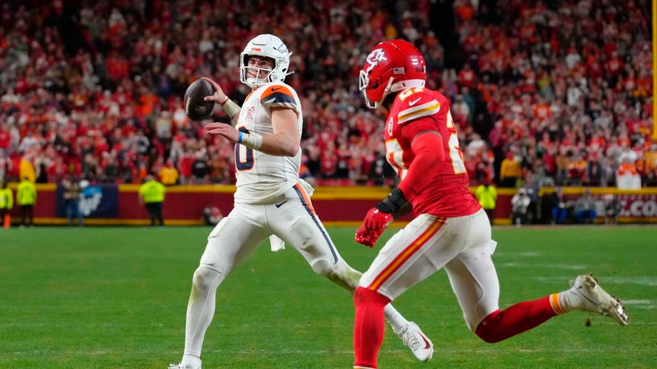 Kansas City.- Bo Nix corrió para anotar antes de lanzar un pase de touchdown a R.J. Harvey con 1:45 minutos restantes en el encuentro, y los Broncos de Denver resistieron en los segundos finales para derrotar este jueves 20-13 a los diezmados Jefes de Kansas City.