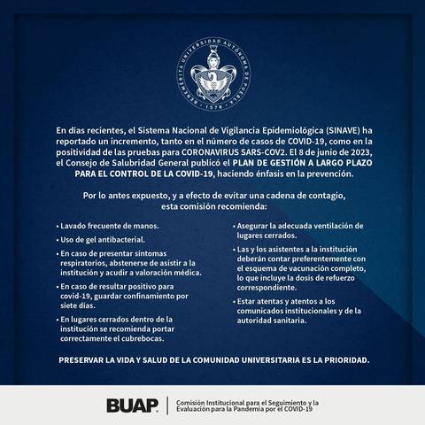 La BUAP realizó el exhorto como medida preventiva ante el incremento de casos positivos de Covid-19 que detectó el SINAVE