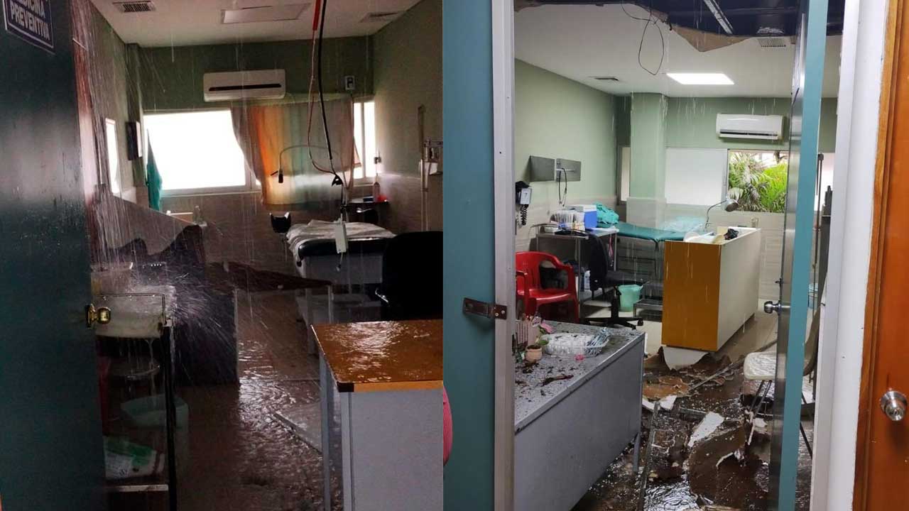 El plafón se desplomó y el agua de la lluvia inundó parte de la unidad médica.