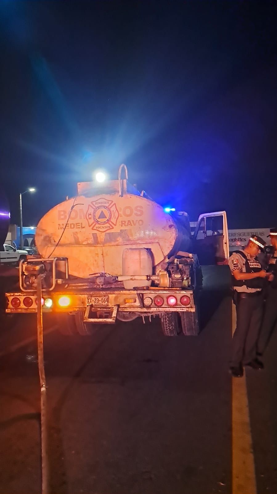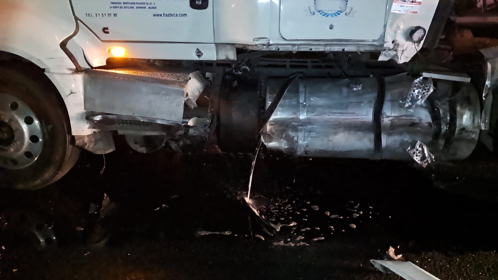 De acuerdo con los primeros reportes, la camioneta chocó de manera lateral contra el tanque de la unidad pesada, ocasionando daños severos que derivaron en una fuga masiva de combustible. Cientos de litros de diésel quedaron regados sobre la carpeta asfáltica, generando un riesgo elevado de incendio.
