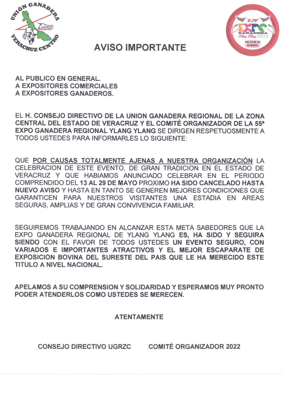 Boca del Río, Ver. – Mediante un comunicado el Consejo Directivo de la Unión Ganadera de la Regional de la zona central del estado de Veracruz y el Comité Organizador de la 55 Expo Ganadera Regional Ylang Ylang anunciaron la cancelación de la fiesta.