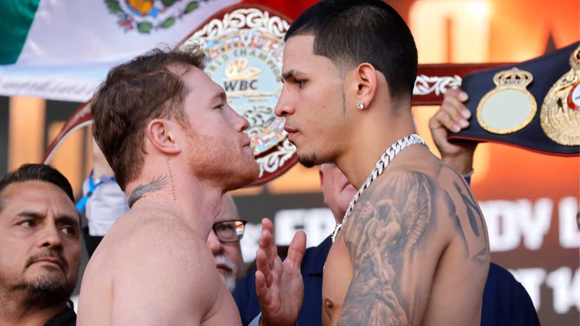 El Canelo marcó 166.8 libras y Berlanga 167.6 libras, así que comienza la cuenta regresiva para ver quién se queda con los cinturones de los supermedianos.