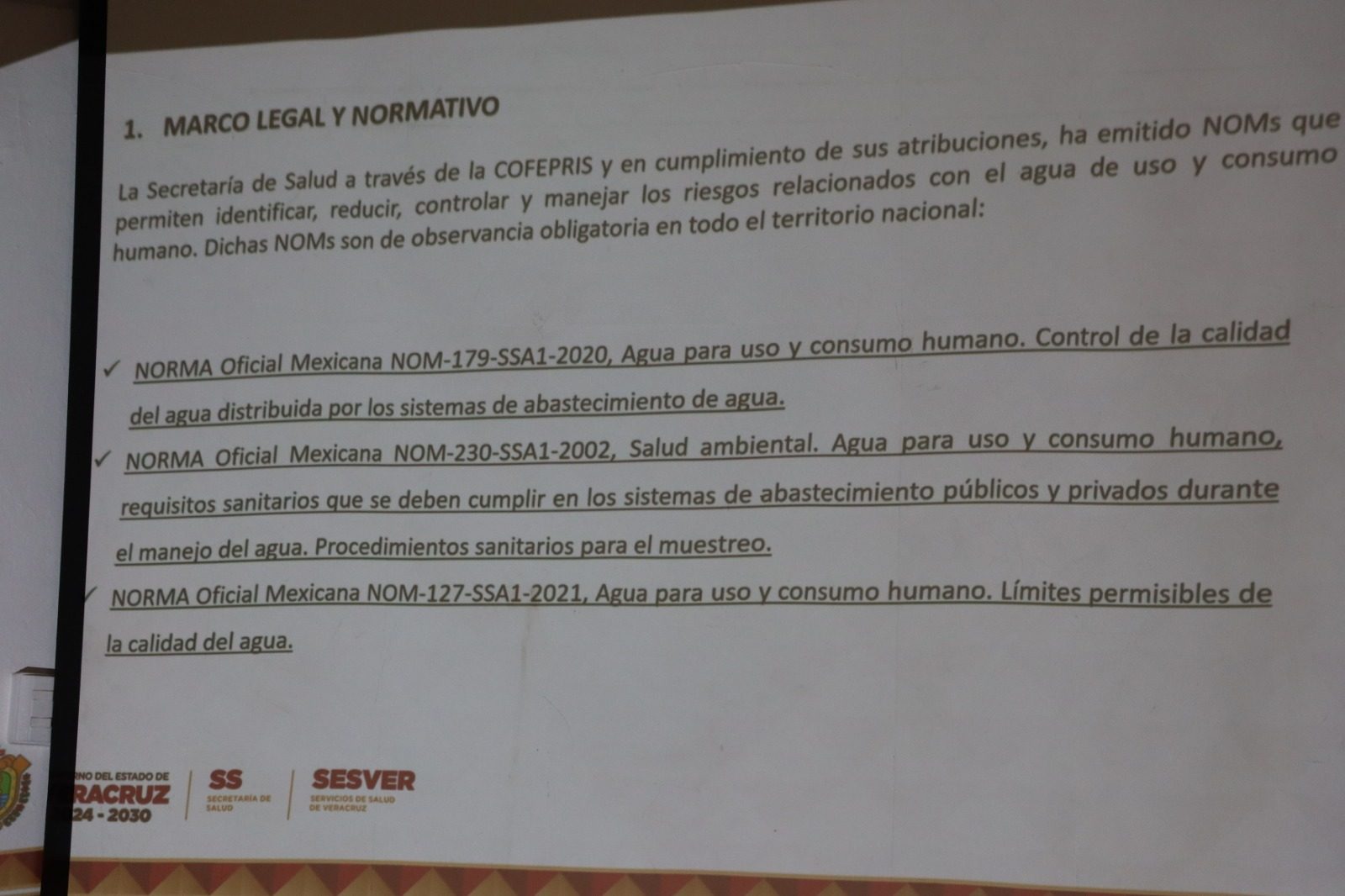 Asimismo, se explicó el marco legal aplicable, destacando lineamientos como la NOM-127-SSA1-2021, que establece los límites permisibles de calidad del agua para consumo humano, así como criterios relacionados con parámetros microbiológicos. Esta información permitirá a los comités implementar acciones más efectivas en la supervisión y mantenimiento de sus sistemas de abastecimiento.