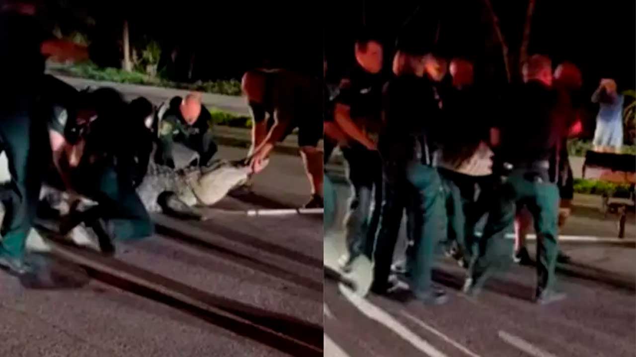 Mientras los oficiales intentaban levantar al caimán, su tamaño y peso se impusieron. En uno de los momentos más tensos del video, un agente pide ayuda con evidente urgencia para controlar una de las patas delanteras, lo que provoca que más elementos se unan a la maniobra.