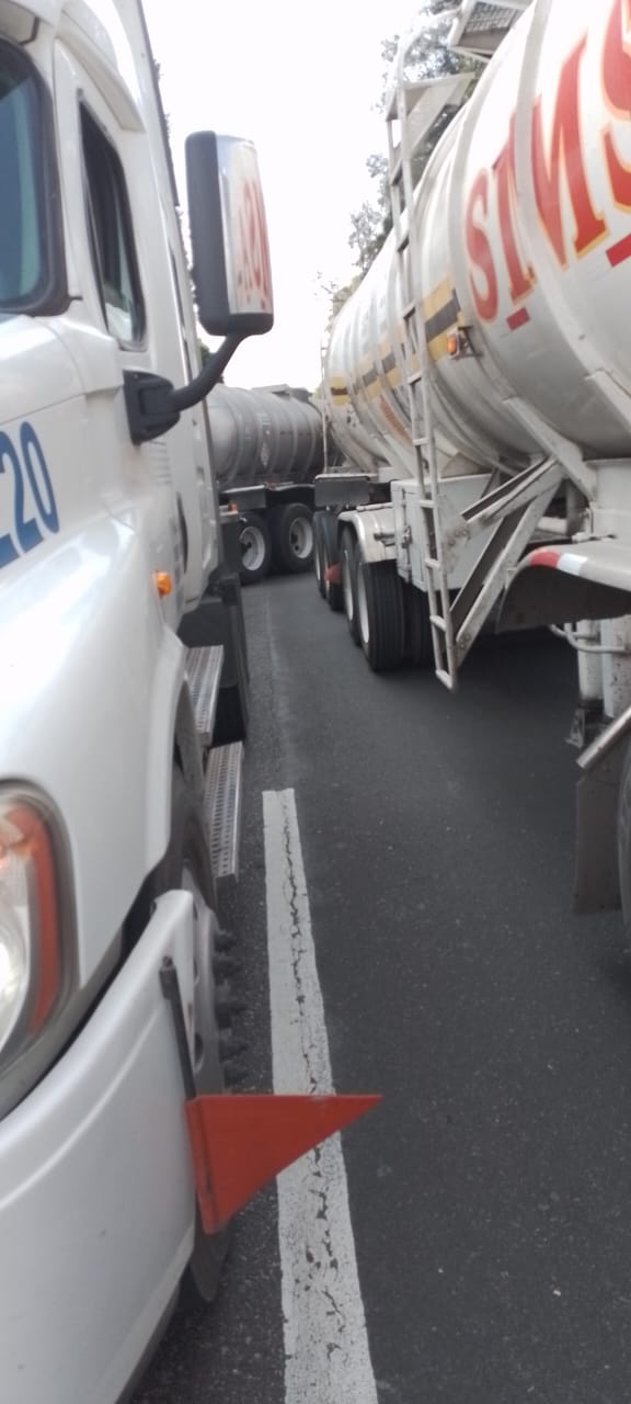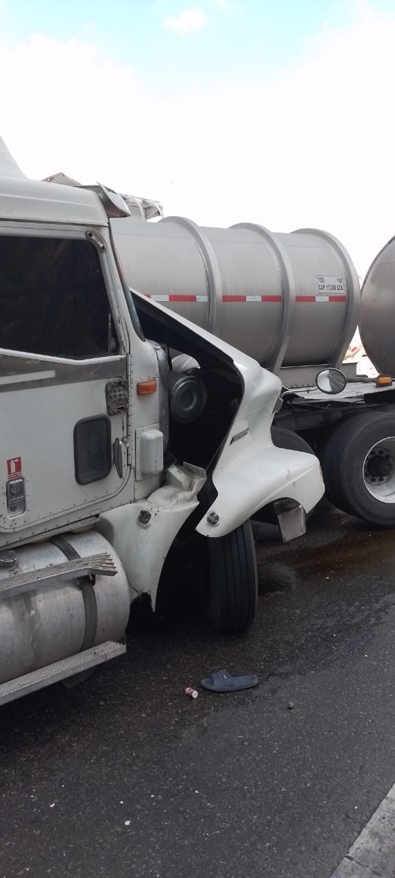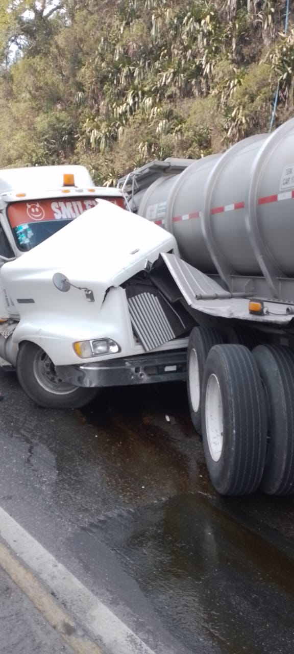 Dos pipas, un autobús de pasajeros y un tráiler cargado con carnes frías se impactaron por alcance a la altura del puente de la barranca de Metlac.