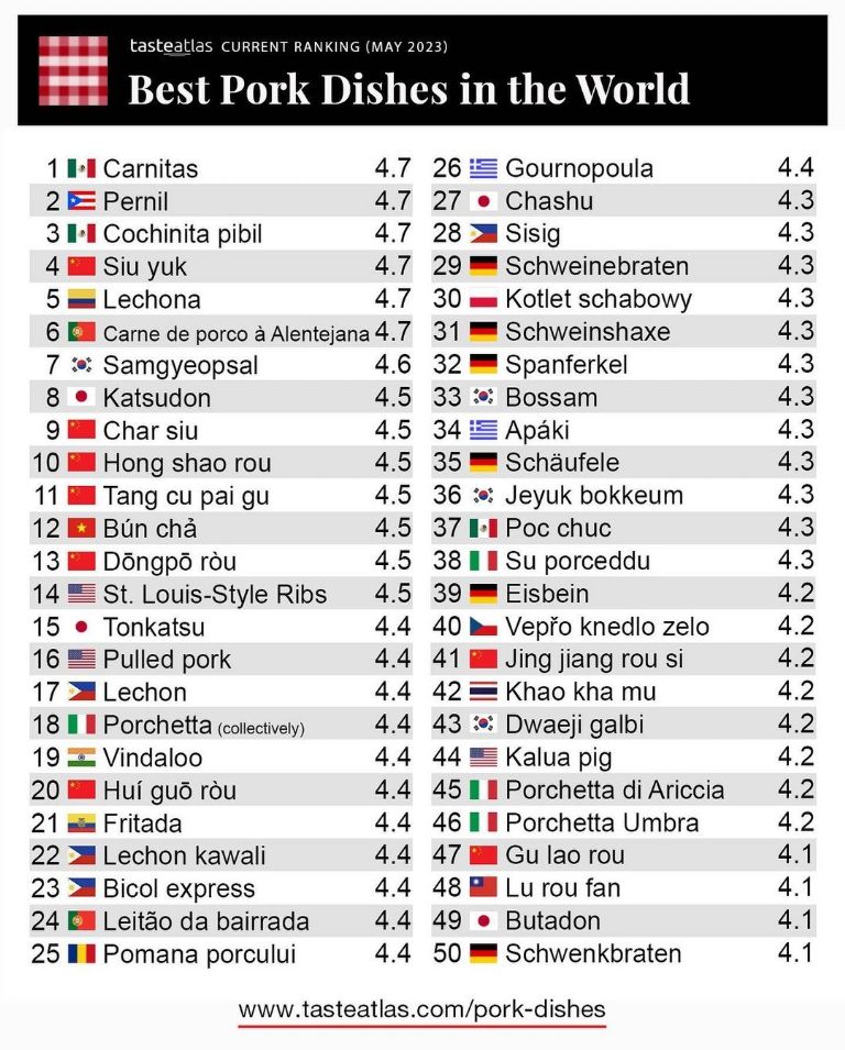 Taste Atlas, la guía de viaje dedicada a promover el turismo gastronómico publicó un nuevo ranking ahora de los 50 mejores platillos hechos con carne de puerco alrededor del mundo y México se subió al podio con dos que son emblemas nacionales y los favoritos de muchos de nosotros: Las carnitas y la cochinita pibil.