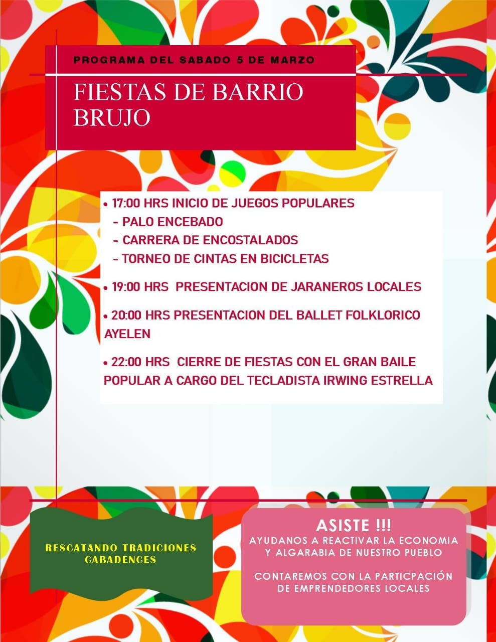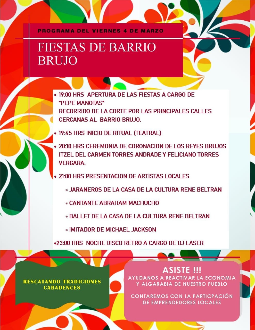 Ángel R. Cabada, Ver.- Cartelera oficial de las fiestas de "Barrio Brujo" del 4 al 5 de marzo. Invitan a toda la ciudadanía de Ángel R. Cabada a asistir y divertirse.