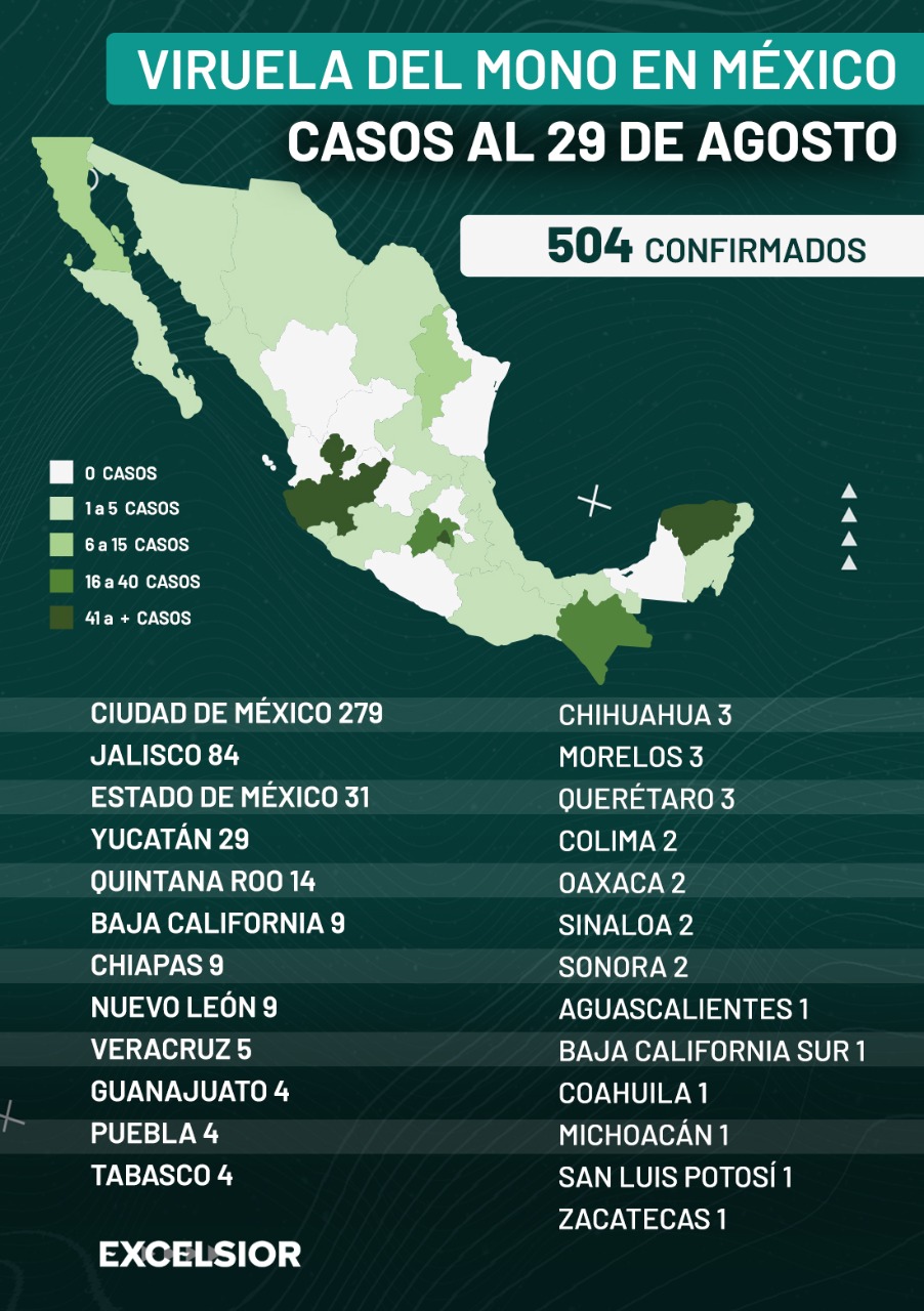 La Ciudad de México se mantiene como la entidad con el mayor número de casos de viruela del mono al concentrar 279 de los 504. La semana pasada registraba 209; los otros estados con viruela del mono son.