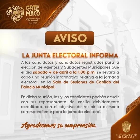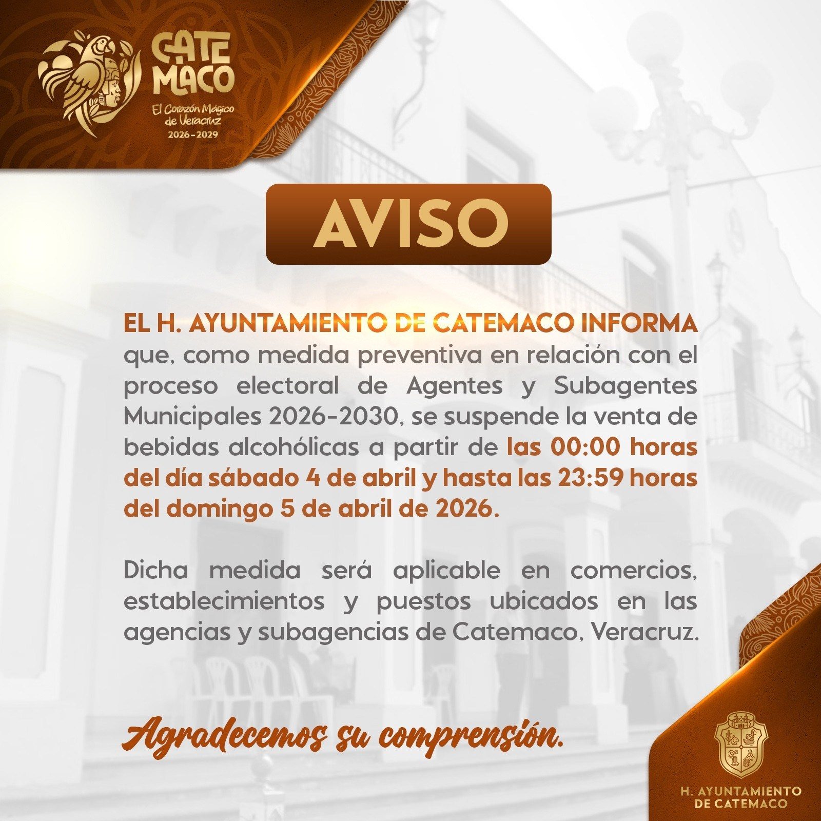 Catemaco, Ver.- El H. Ayuntamiento de Catemaco que preside Manuel Eduardo Toscano, informa que con motivo del proceso electoral de Agentes y Subagentes Municipales 2026–2030, se suspende la venta de bebidas alcohólicas desde las 00:00 horas del sábado 4 de abril hasta las 23:59 horas del domingo 5 de abril, en agencias y subagencias del municipio.
