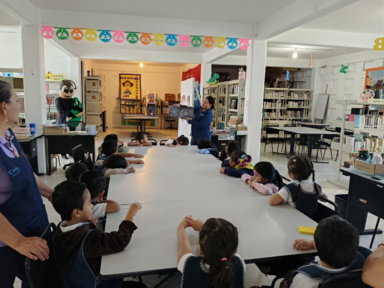 Durante la visita guiada a la biblioteca, los asistentes disfrutaron de una serie de actividades diseñadas para despertar su imaginación y curiosidad, entre ellas el teatro guiñol “Un regalo inesperado”, las lecturas de los cuentos “Si yo fuera bruja” y “El ratón más famoso”, además de una actividad manual y una dinámica de intercambio de libros que fomentó el hábito de compartir y descubrir nuevas historias.