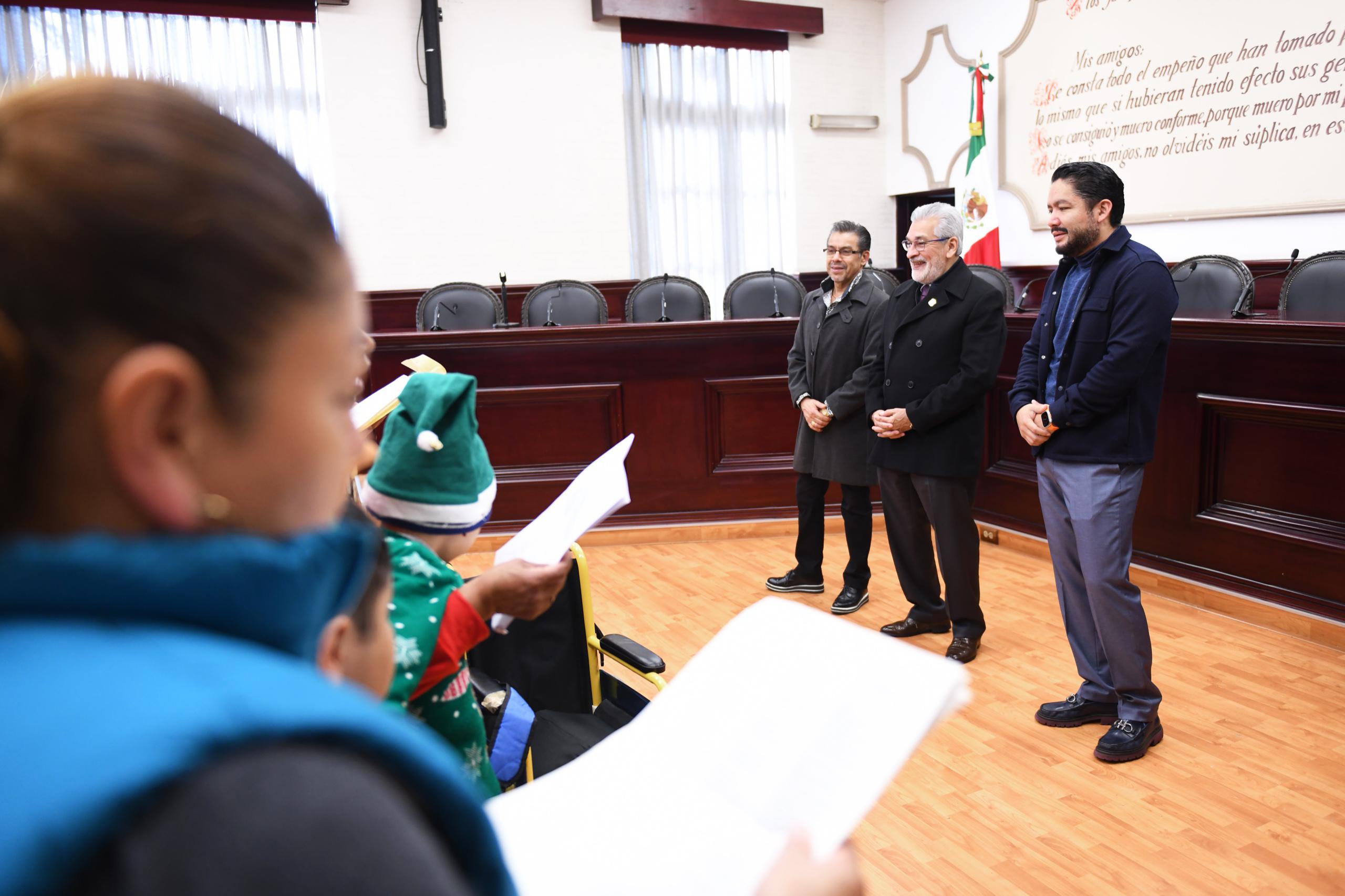 Xalapa, Ver.- Con el fin de contribuir a la preservación de las tradiciones y al desarrollo integral de las infancias, el presidente municipal de Xalapa, Alberto Islas Reyes, recibió en la sala de Cabildo a alumnado de la primaria “Enrique C. Rébsamen” y del Centro de Atención Múltiple (CAM) 128, quienes le cantaron La Rama y villancicos navideños.