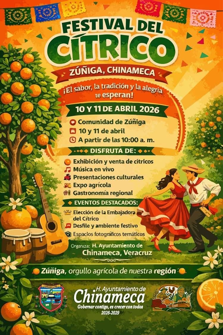 Chinameca, Ver.- El H. Ayuntamiento de Chinameca, Veracruz, que preside Santiago Cortés Padua y su Honorable Cabildo, a través de la Dirección de Cultura y Turismo y Fomento Agropecuario, te invitan a ser parte del “Festival del Cítrico 2026” en la hermosa comunidad de Zúñiga el 10 y 11 de abril.