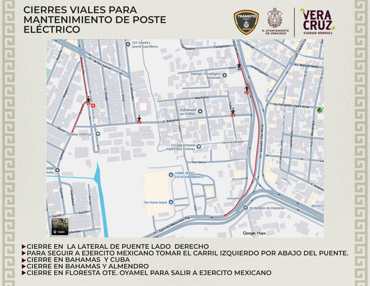 Veracruz, Ver.- El Ayuntamiento de Veracruz informa a la ciudadanía que hoy, 2 de marzo, a partir de las 14:30 horas, personal de la CFE, acompañado por Protección Civil municipal, realizará el retiro de un poste de energía eléctrica que representa un peligro para los transeúntes en la Av. Salvador Díaz Mirón y Bahamas, en la colonia Las Antillas, por lo que se aplicarán los siguientes cierres viales: