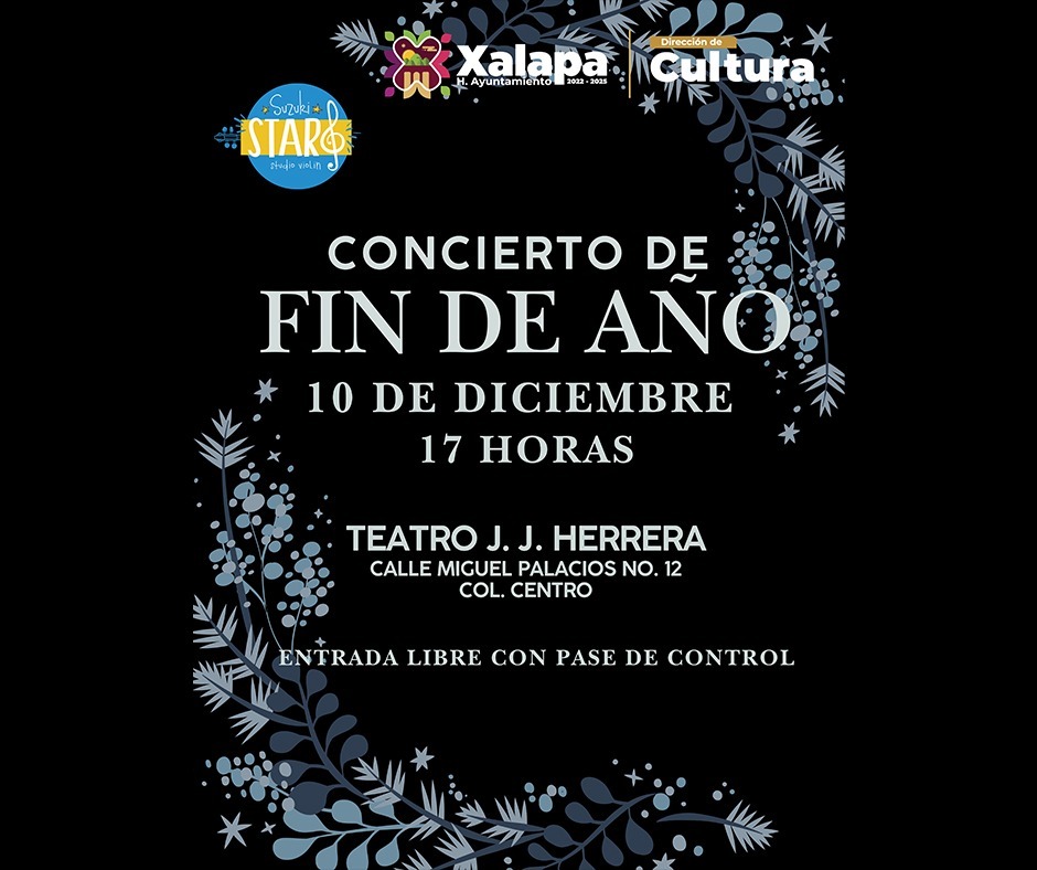A las 17:00 horas, en el Teatro J. J. Herrera, Suzuki Stars ofrecerá su Concierto de Fin de Año; de forma simultánea, en el Museo Casa de Xalapa (Muxa), se impartirá la charla “La vida y mi felicidad”. En el Museo de la Música Veracruzana, a las 18:00 horas, habrá un Recital de Guitarra con alumnos del maestro Rodrigo Carreón.