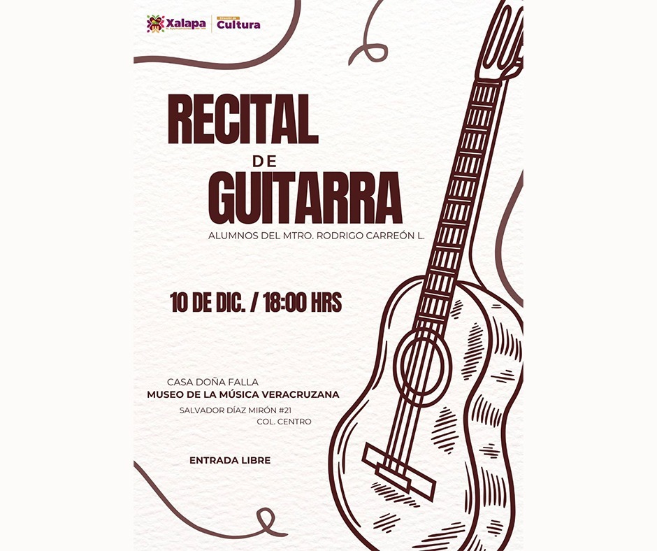 Este martes, a las 17:00 horas, en el Museo de la Música Veracruzana se presentará un Recital de Guitarra, mientras que en el Centro Recreativo Xalapeño (CRX), se ofrecerá el concierto “Navidad a 2 voces”, con Gema y Ricardo.