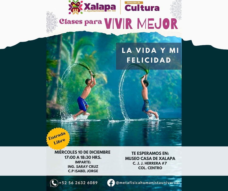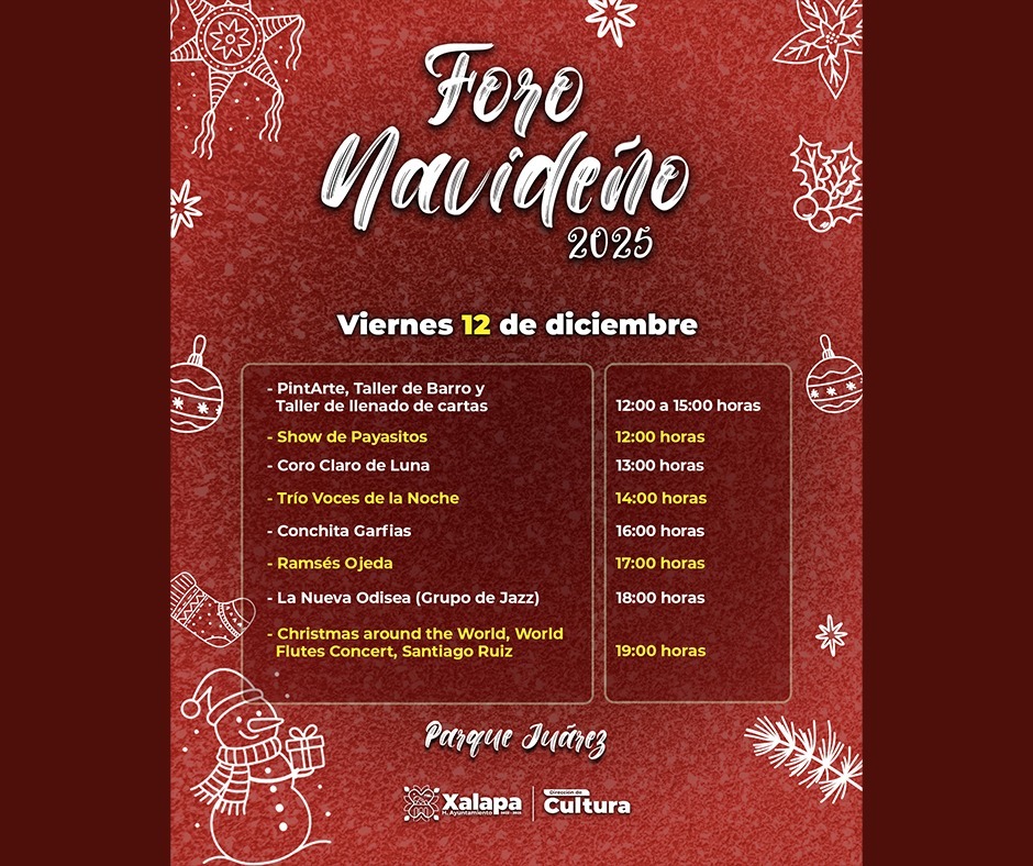 El domingo, desde las 10:00 horas, habrá Terapias Complementarias de Holística Xalapa, en el CRX. A las 12:00 horas, en el Parque Juárez, será el último día del Foro Navideño, que incluirá talleres, show de payasitos y las presentaciones del Coro “Voces de los Tiempos”, Rondalla Romántica Femenil, Danzón pa’l Corazón y Los Tropicosos.