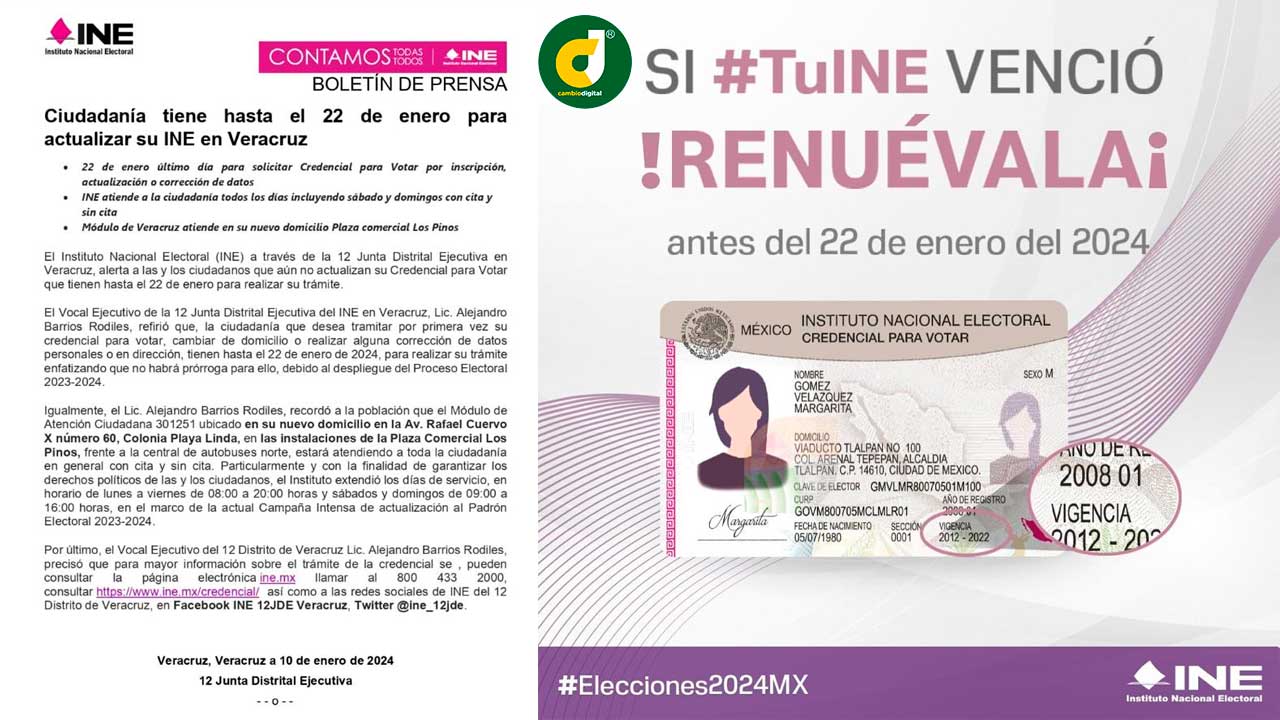 Veracruz, Ver.- El Instituto Nacional Electoral (INE) a través de la 12 Junta Distrital Ejecutiva en Veracruz, alerta a las y los ciudadanos que aún no actualizan su Credencial para Votar que tienen hasta el 22 de enero para realizar su trámite.