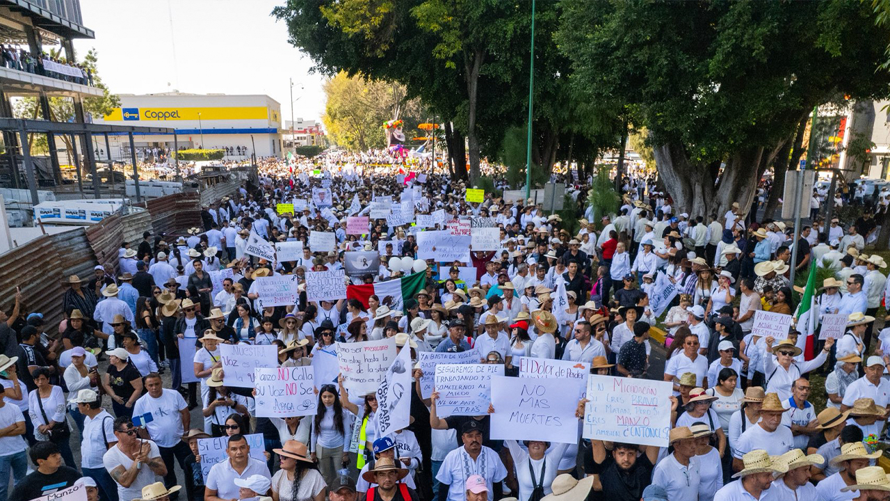 Los manifestantes visten ropas blancas y pancartas con la exigencia de justicia para Carlos Manzo, quien fue asesinado a las 20:10 horas del sábado por un joven de 17 años que, a quemarropa, le dio siete tiros, con una pistola calibre .9 milímetros. El adolescente fue abatido por escoltas del alcalde.