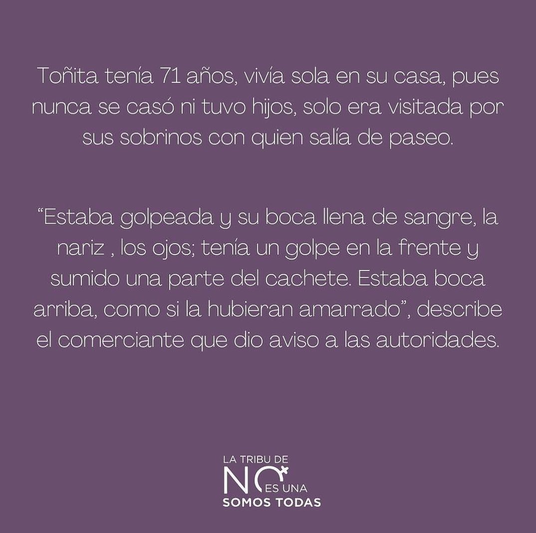 Doña Toñita NO vestía provocativa, NO salía en las noches, NO estaba en el lugar incorrecto. Estaba en su casa como todas las noches tranquila. Entonces nos damos cuenta que NO ES NI LA VESTIMENTA, NI EL LUGAR, NI LA HORA. ‼️‼️‼️