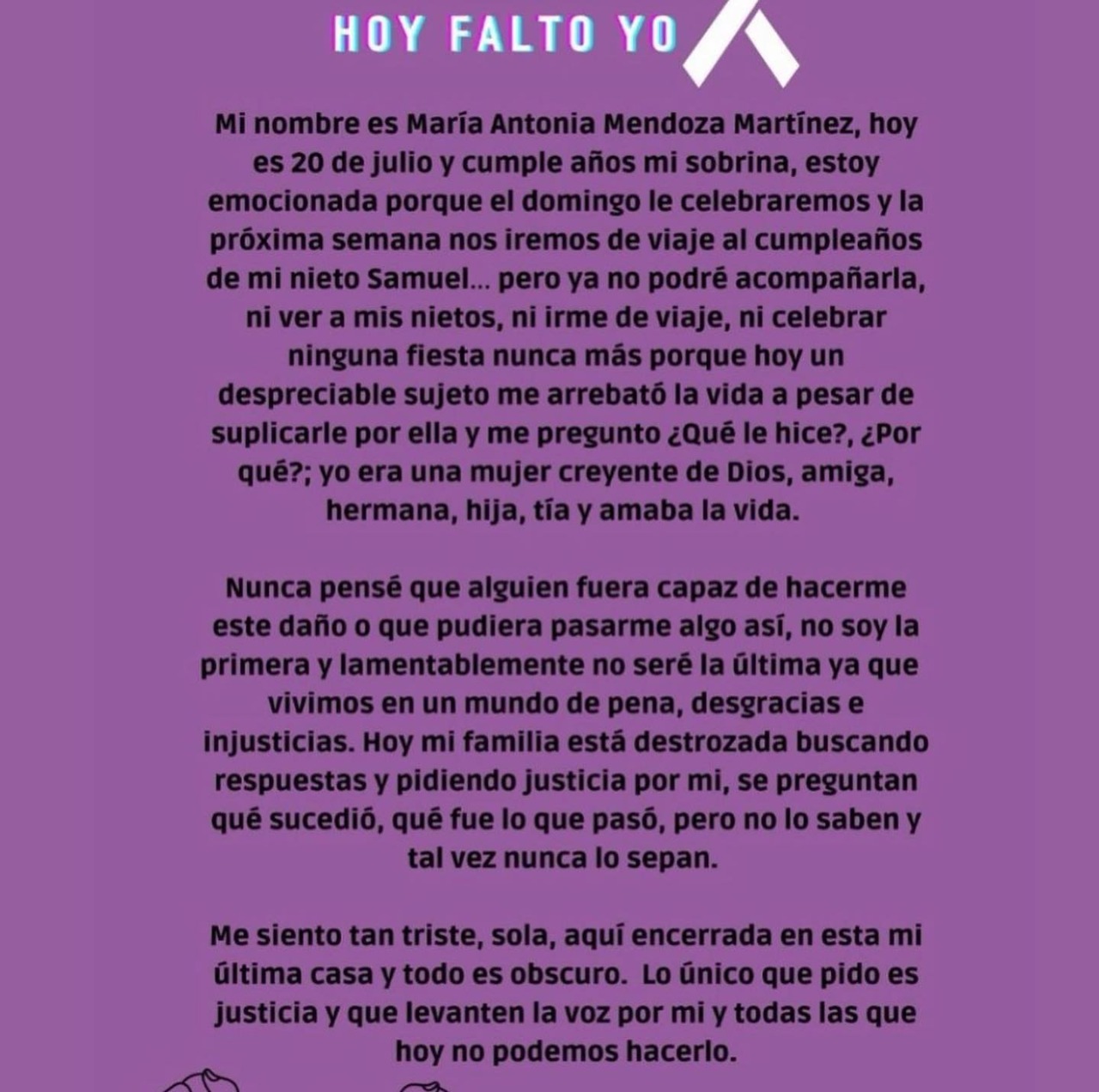 A los que me leen, solo les pido COMPARTAN que NADA les cuesta apoyar a difundir hasta que se haga justicia. Hoy nos falta doña Toñita, mañana puede ser cualquiera dentro de su círculo.