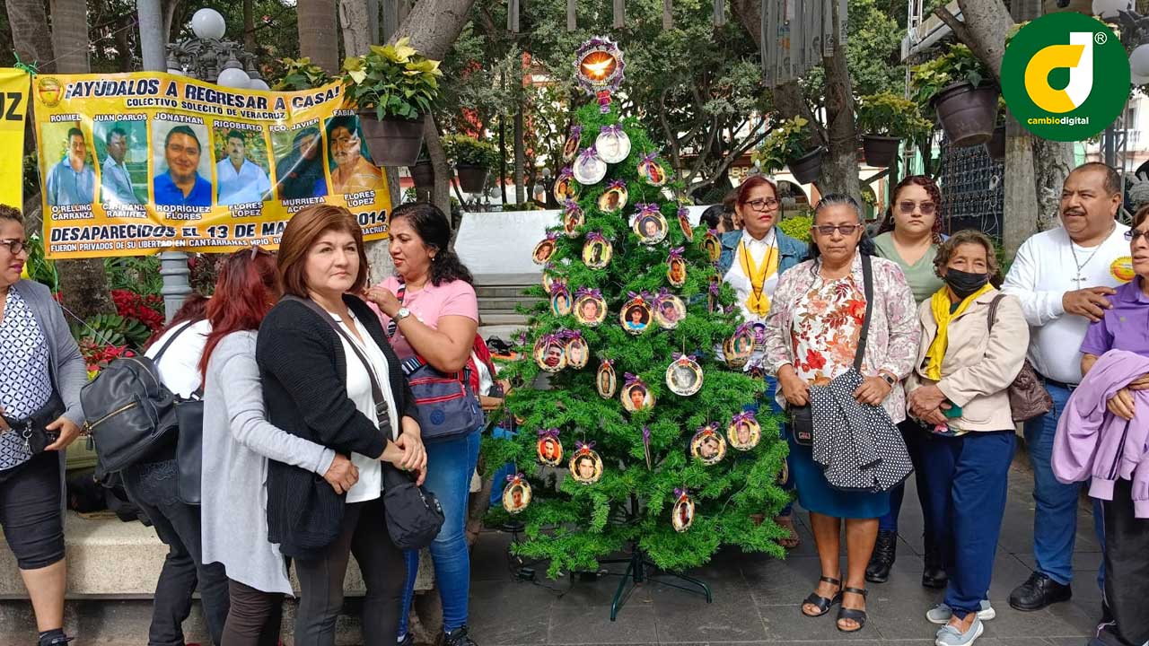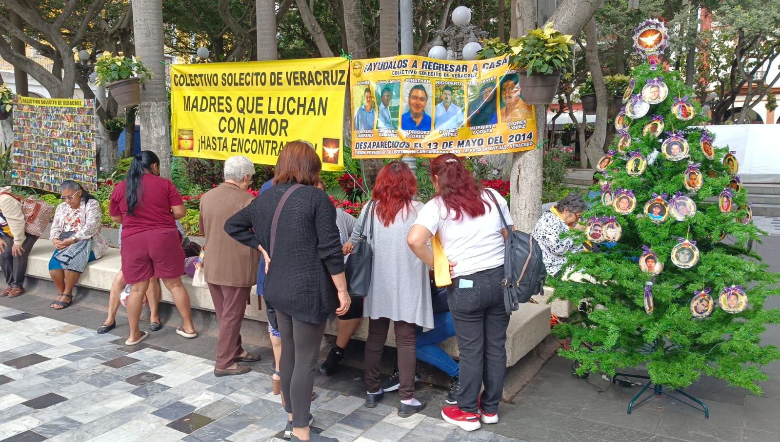 Veracruz, Ver.- Integrantes del Colectivo Solecito colocaron el “árbol del dolor” en el zócalo de Veracruz con el objetivo de visibilizar la crisis de desapariciones, recordar a sus familiares y exigir justicia por cada uno de ellos.