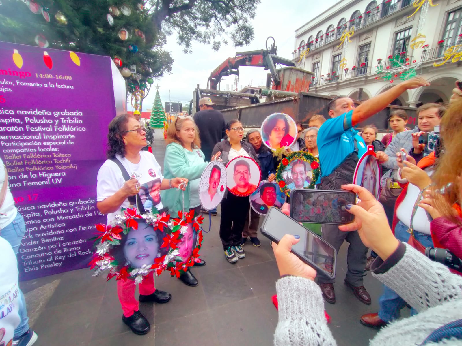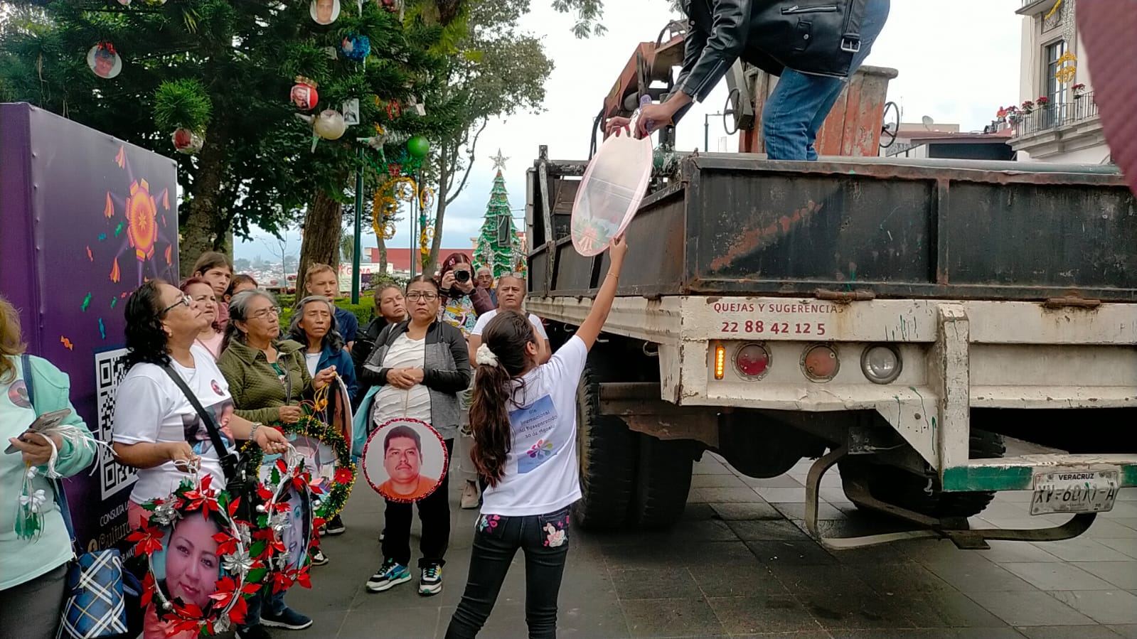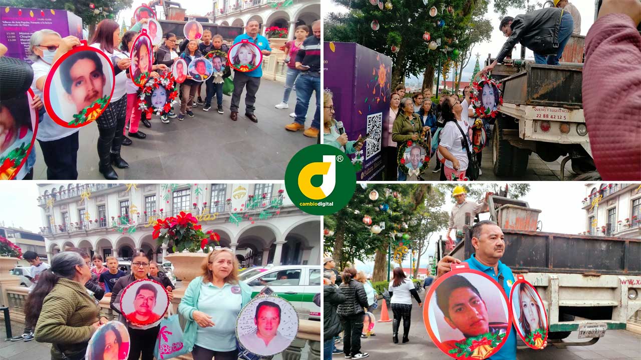 Los “adornos navideños” del pino de más de 25 metros de altura, localizado a un costado de Palacio de Gobierno en la capital veracruzana, busca visibilizar el drama de desapariciones que se vive en Veracruz y el resto del país, señalaron madres y padres de desaparecidos en la zona de Xalapa.