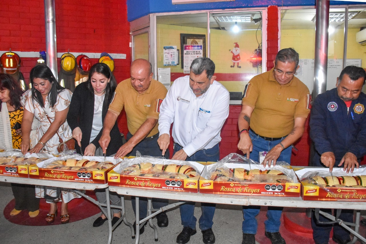Comparte Amado Cruz rosca de reyes con personal de Limpia Pública, PC y Bomberos