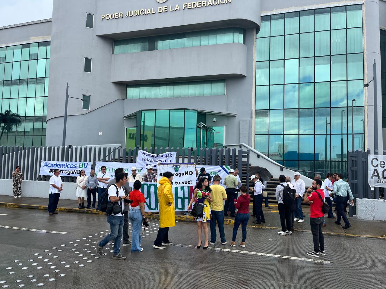 Boca del Río, Ver.- Integrantes de la comunidad académica de la Universidad Veracruzana (UV) se manifestaron de forma pacífica este miércoles frente al edificio del Poder Judicial de la Federación, ubicado en Boca del Río.