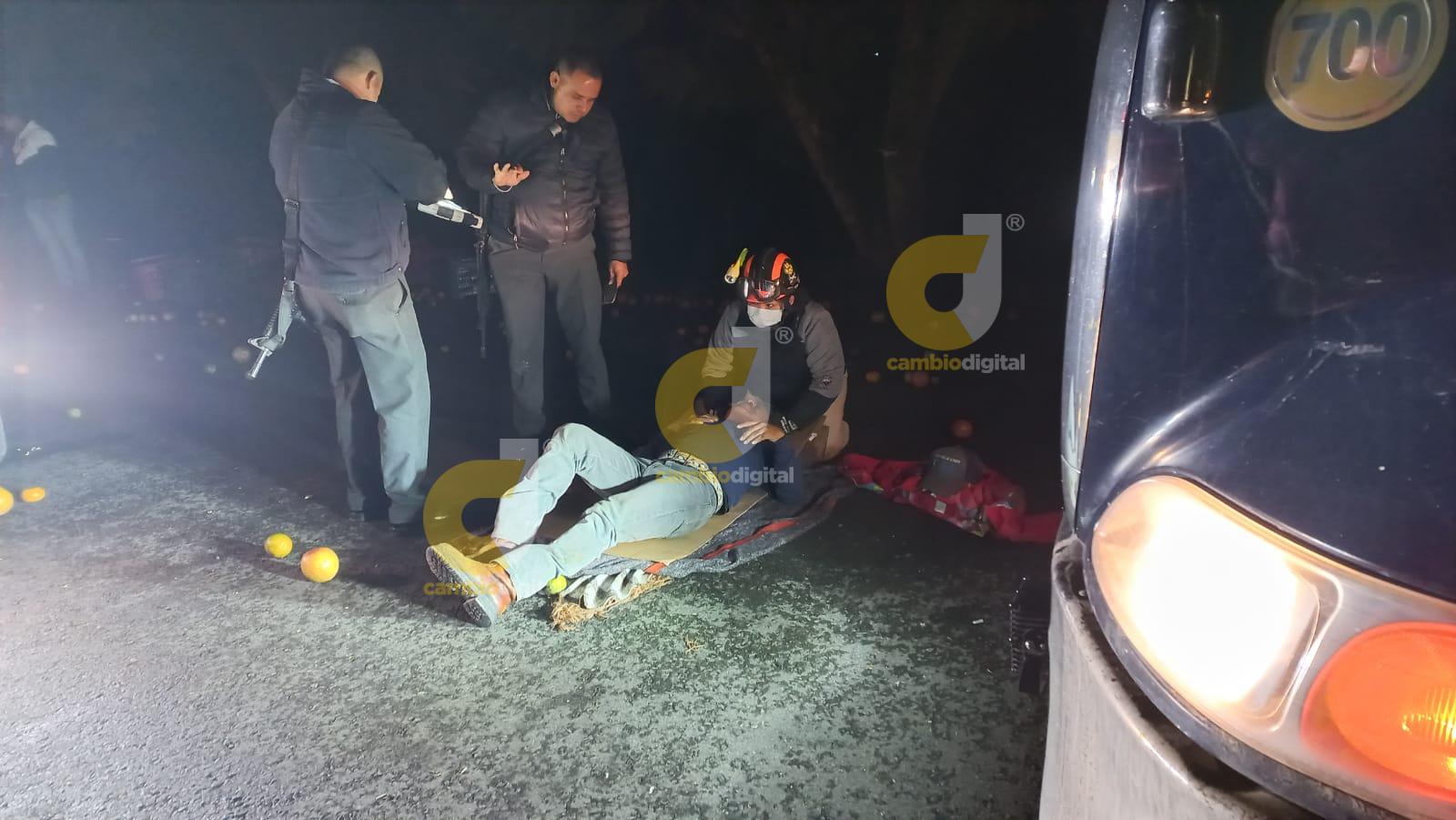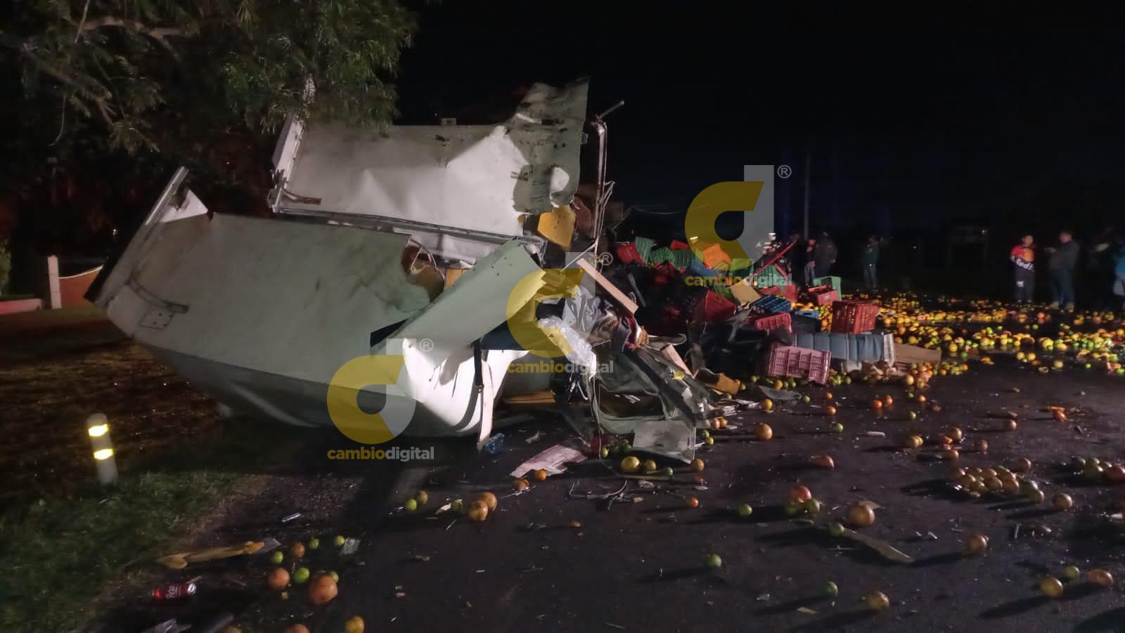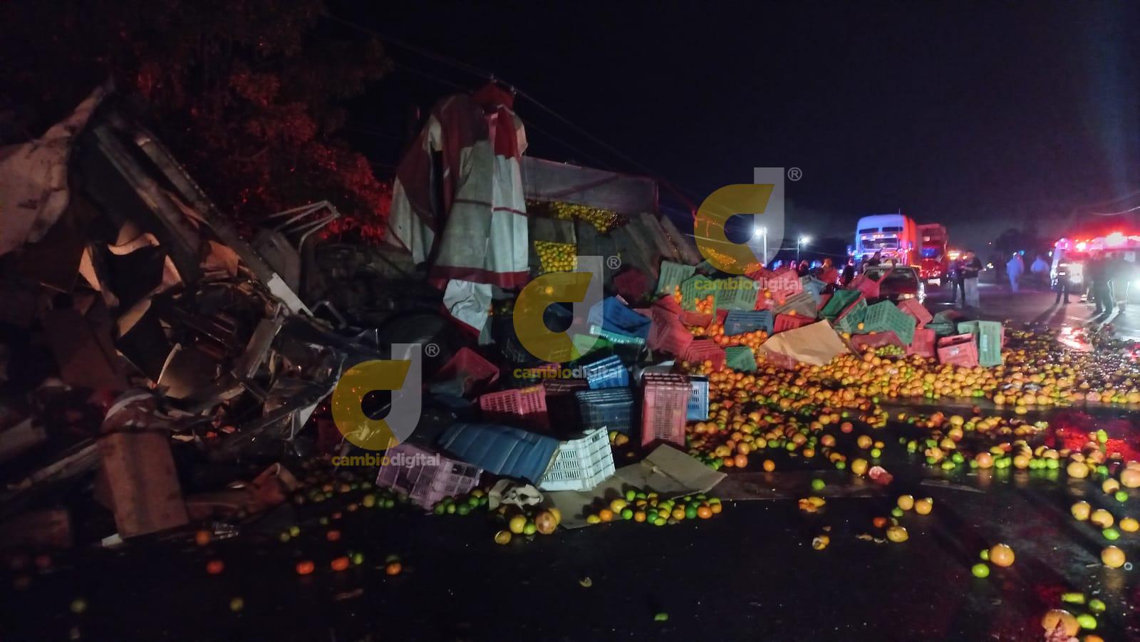 Este aparatoso accidente se suscitó cuando un tractocamión marca Keenworth Kemex blanco con placas de circulación SK-515 del estado de Puebla con redilas rojas, transportaba 12 toneladas de naranja y cuyo conductor lo hacía sin precaución.