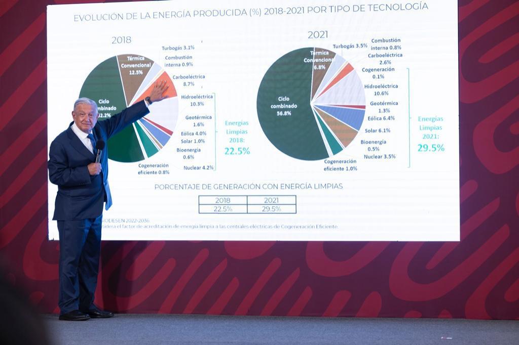 Explicó que en 2021 México produjo el 29.5% de energías limpias, mientras que en 2018, sólo el 22.5%.