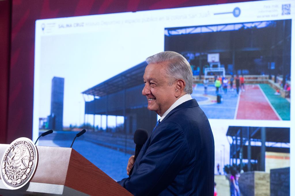 • Asentó que en todas las comunidades y municipios por donde pasa el tren del Istmo se hacen obras en beneficio de la población, por ejemplo, en el sureste se han invertido 50 mil millones de pesos para campos de fútbol, mercados, malecones, plazas, ciudades deportivas y miles de viviendas.