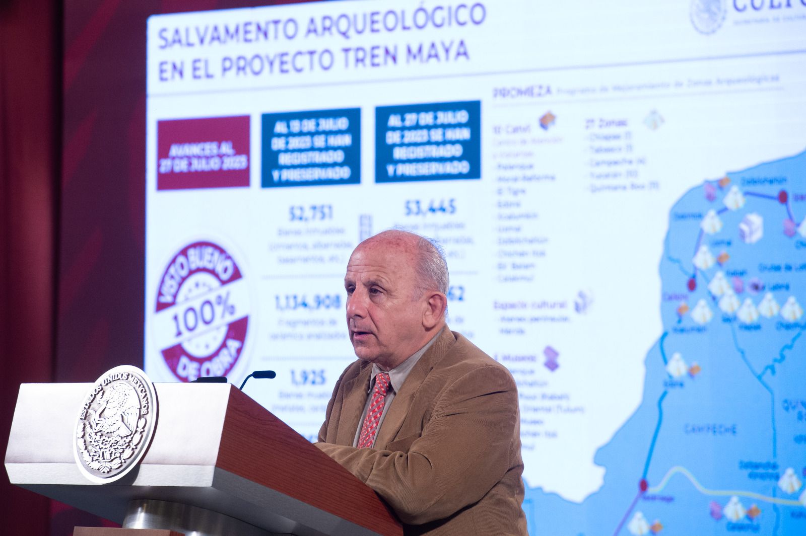 • Diego Prieto, director del INAH, informó que, del tramo 1 al 7 del Tren Maya, al 27 de julio de 2023 se han registrado y preservado 53 mil 445 bienes inmuebles, un millón 193 mil 562 fragmentos de cerámica analizados y mil 925 bienes muebles.
