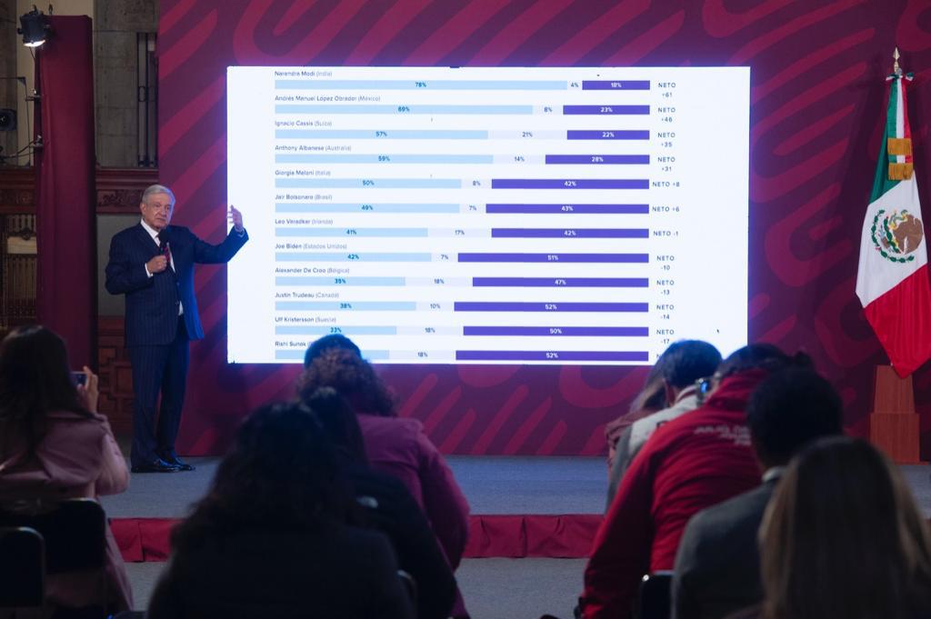 • López Obrador destacó que en el último sondeo de 2022 de Morning Consulting se encuentra en segundo lugar de los presidentes mejor evaluados del mundo con un 69% de aprobación; comentó que en una ocasión estuvo durante una semana en primer lugar.