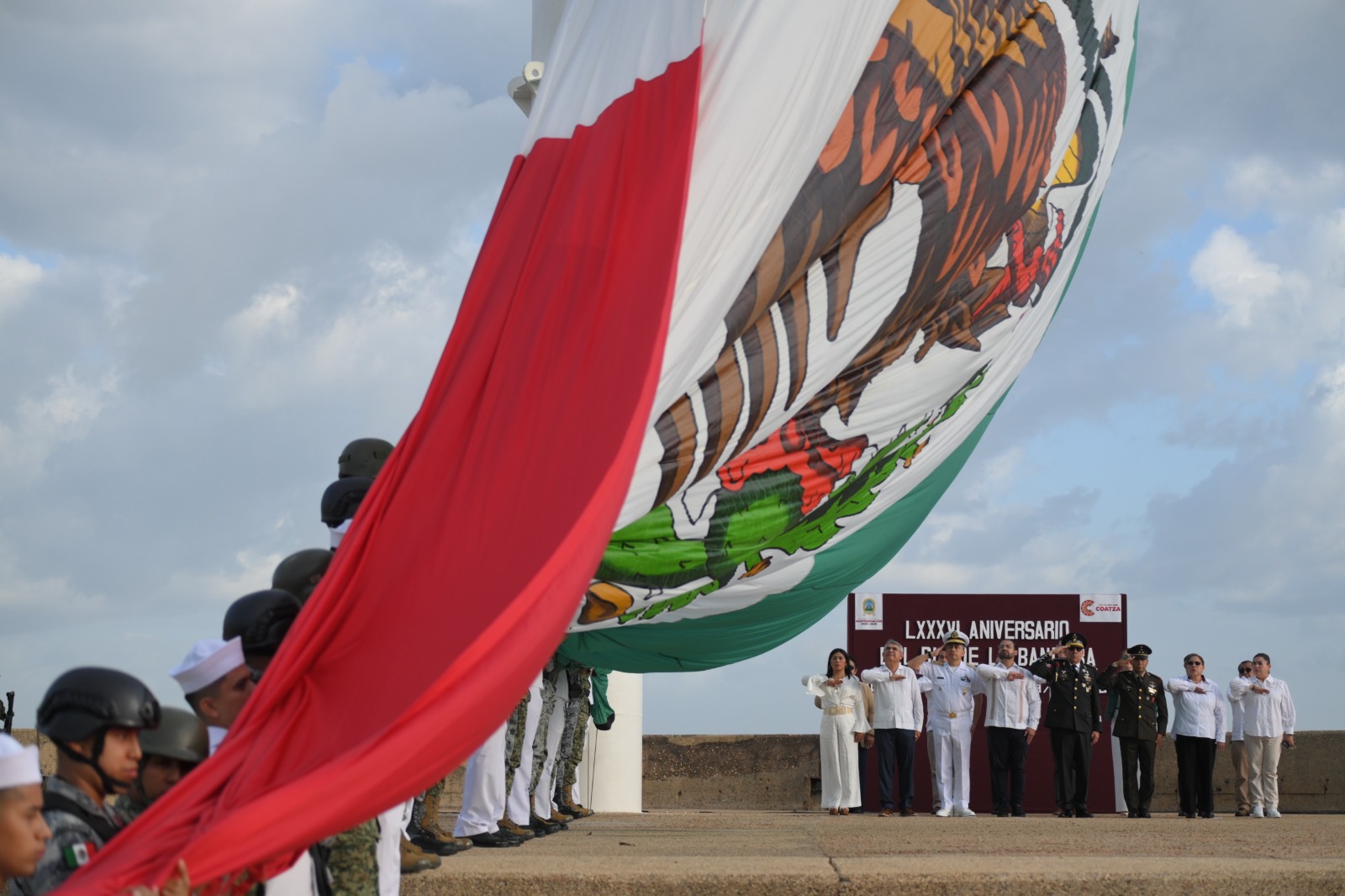 Coatzacoalcos, Ver.- En el marco del 86 aniversario del Día de la Bandera de México, el Gobierno de Coatzacoalcos encabezó un acto cívico en el que autoridades municipales, navales y militares destacaron la importancia de respetar los símbolos patrios como base para fortalecer la identidad nacional y promover los valores cívicos entre la ciudadanía.