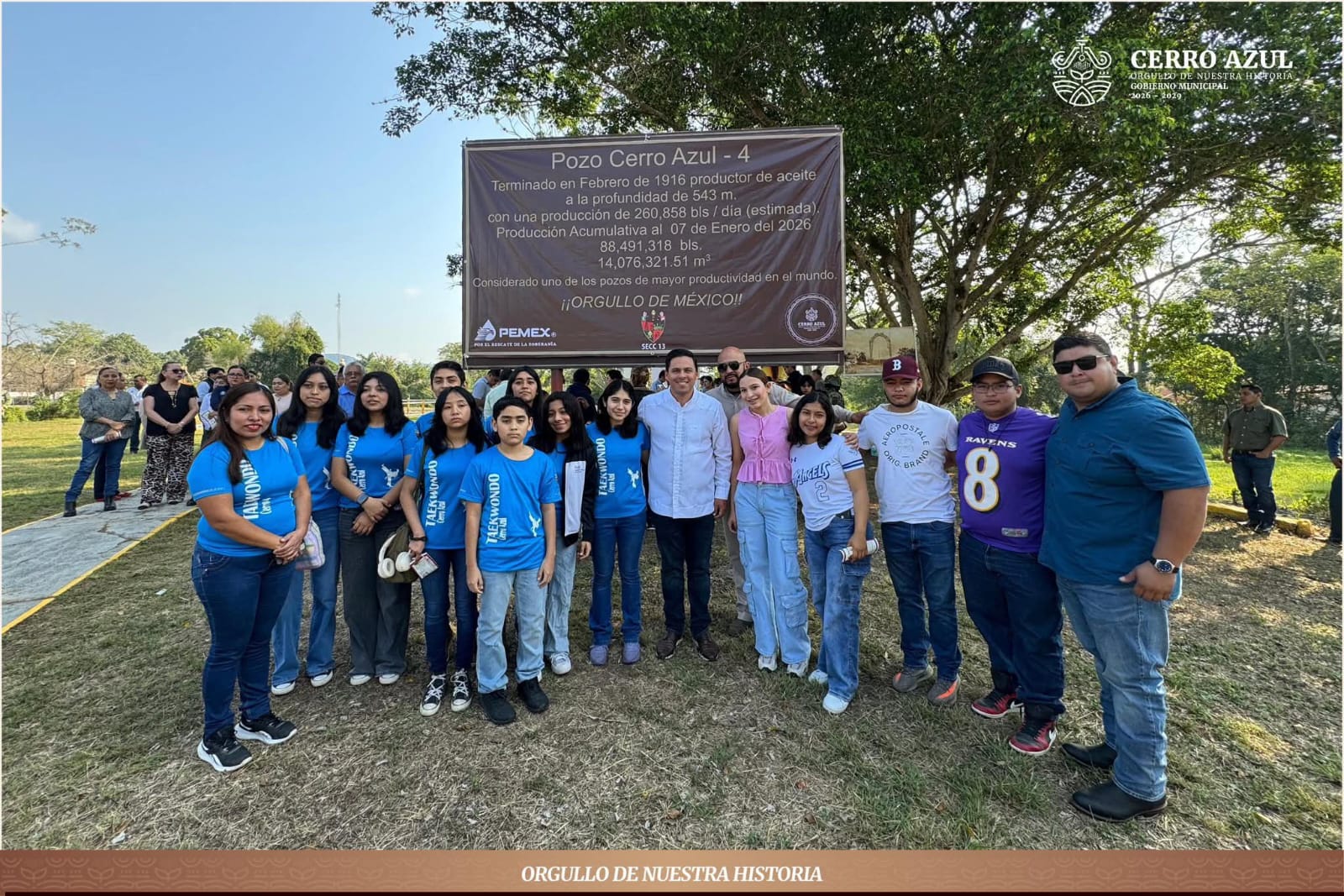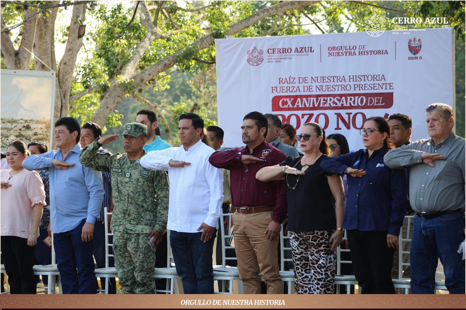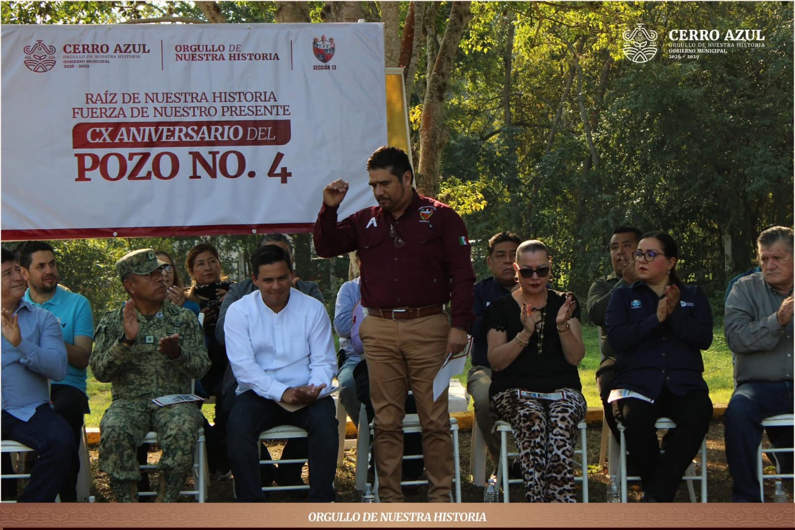 Con motivo del 110 aniversario del Pozo Cerro Azul No. 4, uno de los mayores pozos productores del mundo, el H. Ayuntamiento de Cerro Azul, a través de COPLADEMUN y el Cuerpo Edilicio, llevó a cabo un acto solemne encabezado por el Presidente Municipal Fernando Hernández Spinoso, acompañado por el Secretario del Ayuntamiento José Reyes Cáceres y la Síndica Laura Vivían Mendo Vargas, así como las y los regidores Pamela García Trujillo, Itzel Aimé Cuervo Gómez, Silverio de la Cruz, Maricruz Monroy Ornelas y Cristian Feliciano Hernández.