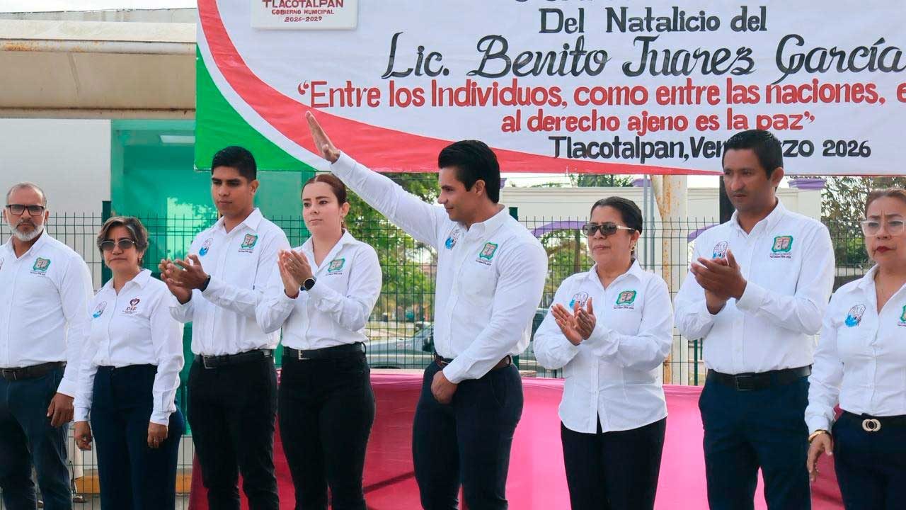 Tlacotalpan, Ver.- En el marco del 220 aniversario del natalicio de Benito Juárez, el alcalde de Tlacotalpan, Christian Romero Pérez, acompañado de ediles y directores de área, encabezó un acto cívico en el parque de la Alameda Juárez, reafirmando el compromiso del gobierno municipal con la memoria histórica y los valores que dieron forma a la nación.